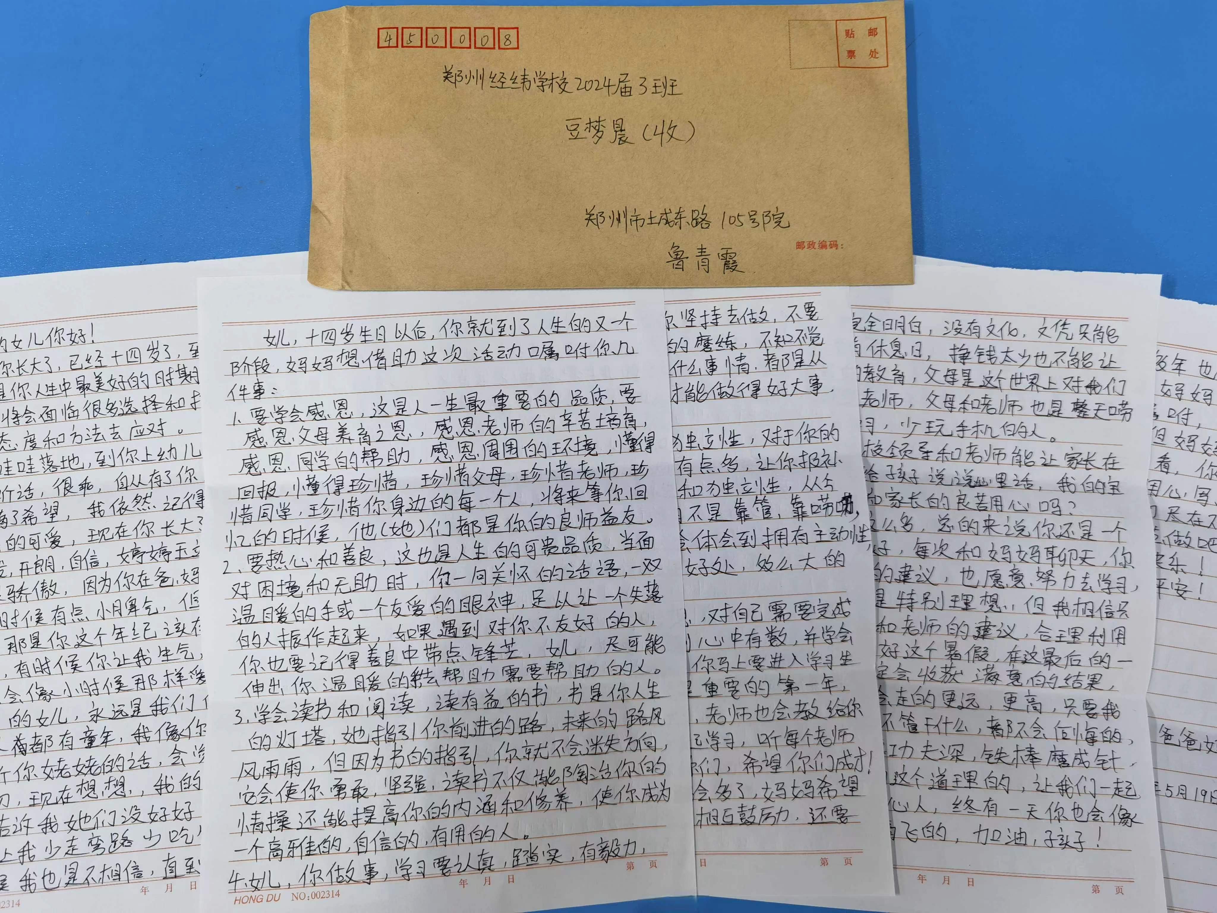 有这样一封信,上面记录着我们的心情,走得再远,也走不出父母的牵挂;有这样一封信,名为“青春”,承载着父母的寄托,诉说着成长的感动。6月1日下午,金水区经纬学校政教处组织各班进行“爱的回音壁”活动,号召2024届学子给亲爱的父母写一封回信,向他们表达自己的感恩与成长。