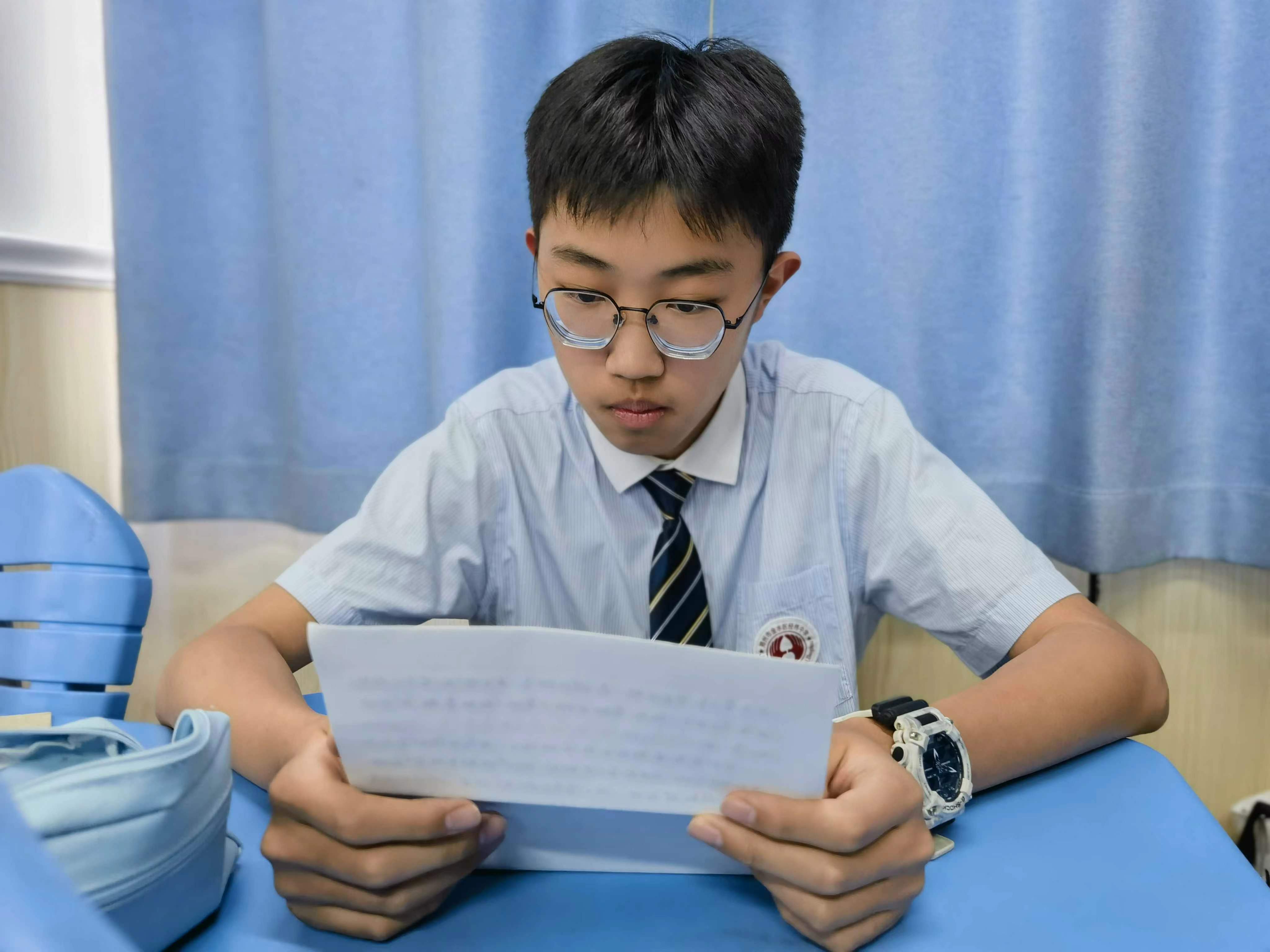 接下来,同学们在学校定制的信纸上,用心用情地为父母写回信,在信封上创意设计,用文字向父母表达自己的感恩和成长。现场的他们或若有所思、或悄悄啜泣,此时此刻的他们更理解父母的付出和辛苦,更懂得感恩父母,更清楚青春如何飞扬?