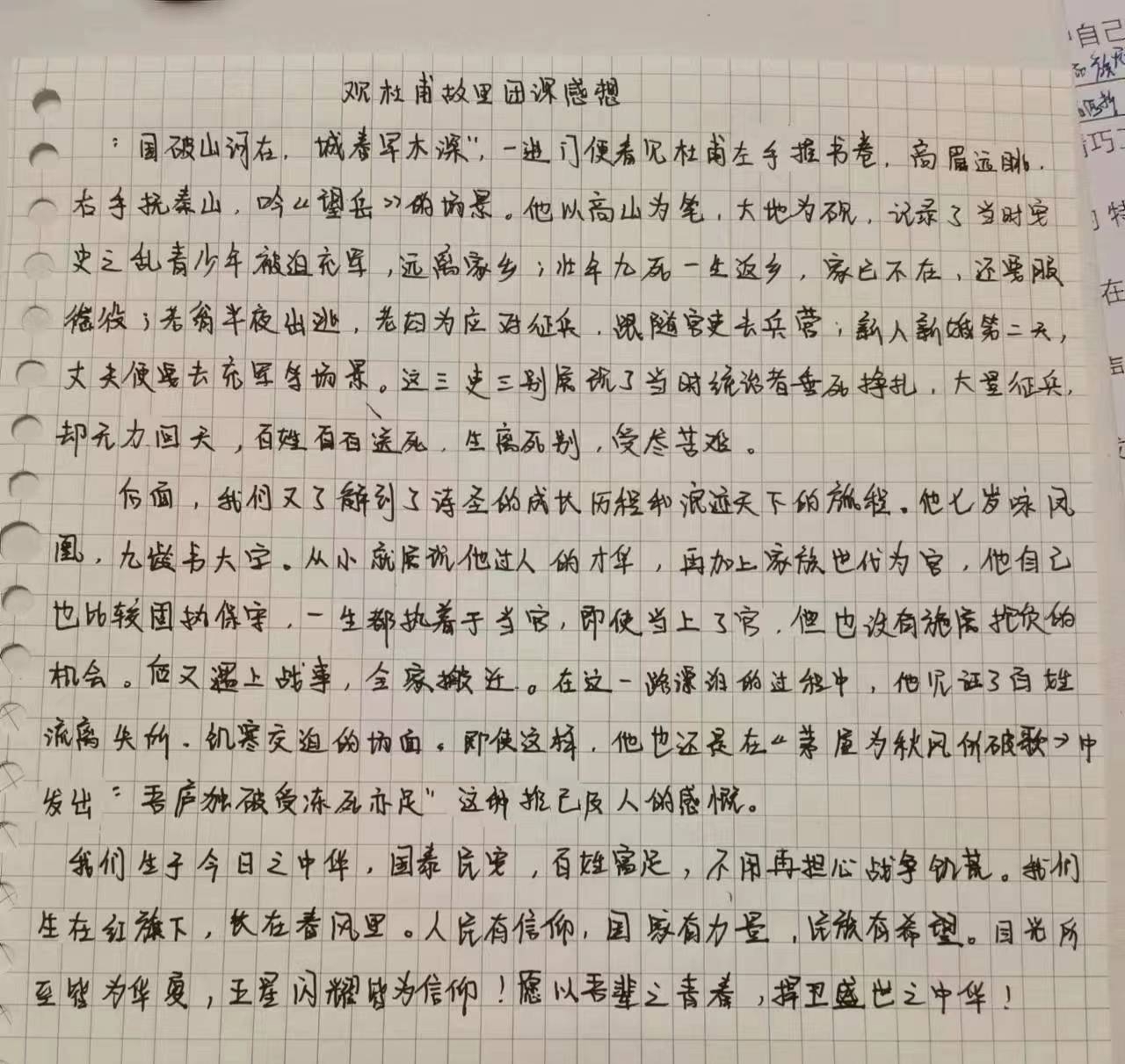 参观过程中,景区讲解员向大家讲述诗圣杜甫的事迹,并号召全体师生要珍惜来之不易的幸福生活。学校团委副书记陈东林勉励大家做爱国主义的坚守者和传播者,学习杜甫“国破山河在,城春草木深”这心忧天下的爱国情怀,学习杜甫“穷年忧黎元,叹息肠内热”这心系苍生的为民情结,始终把国家富强、民族振兴、人民幸福作为努力的志向,做积极向上、身体健康、热爱生活、热爱祖国、情趣高尚的新时代好青年。