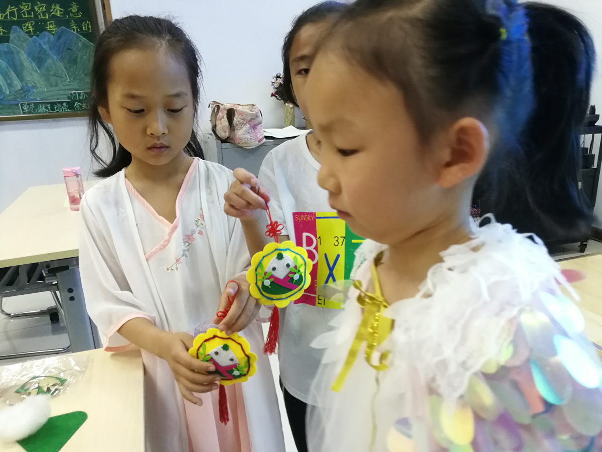 刘杰老师从中国传统节日说起,介绍了端午节的由来、习俗和有关端午节的诗词。端午节源于民间祈求安康的美好愿望和对楚国大夫屈原的纪念,形成了端午节一系列习俗,包括插艾草于门楣,以驱瘴气;涂雄黄酒,以防虫豸叮咬;佩戴香囊,以驱邪避瘟;佩戴五彩线,以避邪祈求安康。端午龙舟竞渡和吃粽子的习俗,源于屈原投江自尽时,当地民众划龙舟和往江中投放粽子,以驱散和引开江中之鱼,避免屈原的身体被鱼吃食。在刘杰老师生动有趣的端午文化梳理中,孩子们听得津津有味。一些年幼的孩子虽然还尚懵懂,但在知识熏陶中,中华民族传统节日——端午节的文化,已经植根于孩子们幼小的心灵里。