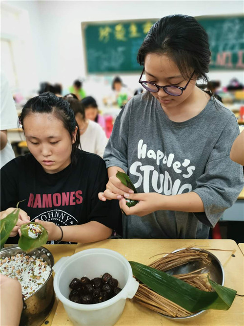 唔……教室里怎么还有一种特别香甜的味道?!原来还有一部分同学在裹粽子!“折一下叶边做漏斗,像这样裹粽叶,用手掌压,然后这个线要裹紧点,不然会漏米的。”几个“经验丰富”的同学当起了小老师,指点着大家裹粽子的手法。同学们撸起袖子,精神十足,变戏法一样变出一个个裹满花生、江米和蜜枣的粽子。这些粽子大小不一、形态各异,里面裹着的不仅有花生、江米和蜜枣,还有老师和同学们之间浓厚的情谊!