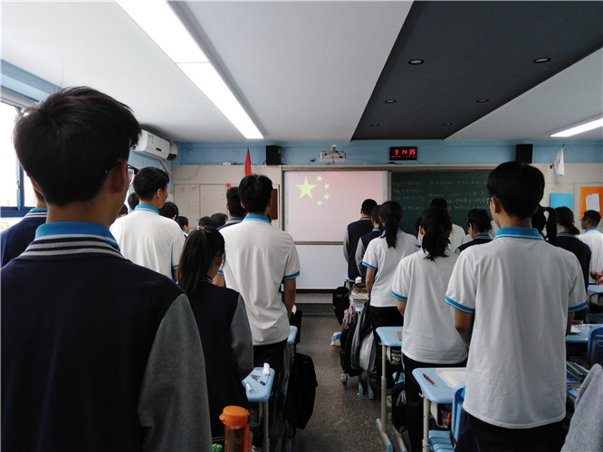 面对班班通上的国旗,学生们齐唱国歌,庄严宣誓