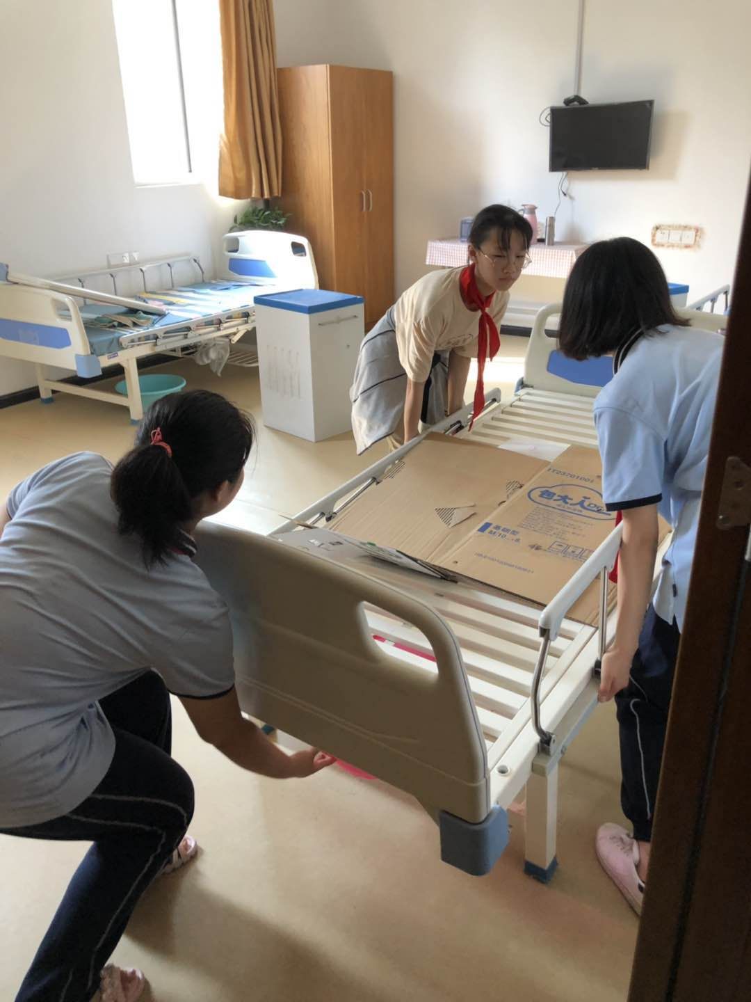 在老人们休息的间隙,同学们又上到二楼帮忙整理老人们的起居室。这时两位小伙子一马当先,张元同学一刻也不停歇,不管是搬床还是打扫卫生,都不遗余力。郭冰雨同学则很细心地在一旁提醒着,小心碰到东西,也时刻提醒大家注意手等等。女同学们同样不甘示弱,各司其职,尤其是龙心一同学,作为本次活动的发起人,也是身先士卒,不怕苦,不怕累。