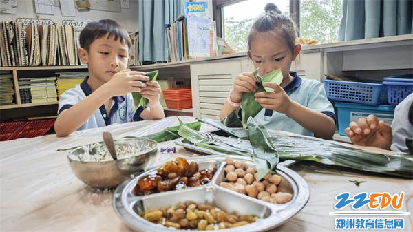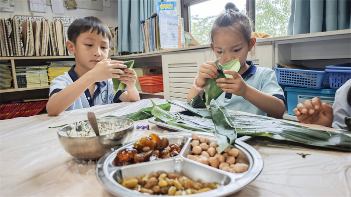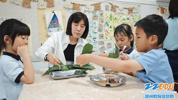家长志愿者带领孩子们开始学习包粽子