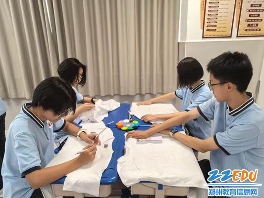 “它可能是你衣柜里最普通的一件,但这一次,它将成为你在青春征途上的第一张画布,请在青春铺作的白T上注入明媚色彩,描绘颗颗绚烂的向往之心,勾画美丽人生!”伴随着郑州八中新校区美术教师史啸威的引导语,师生一起开启了别开生面的“肆意青春,自由涂鸦”活动。