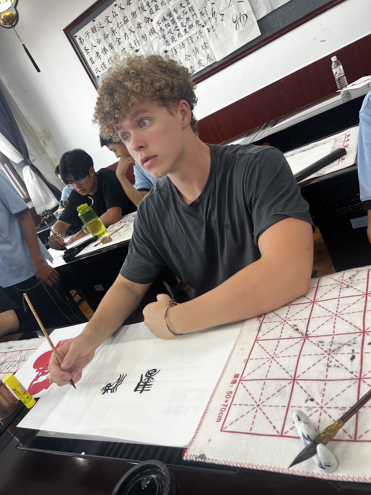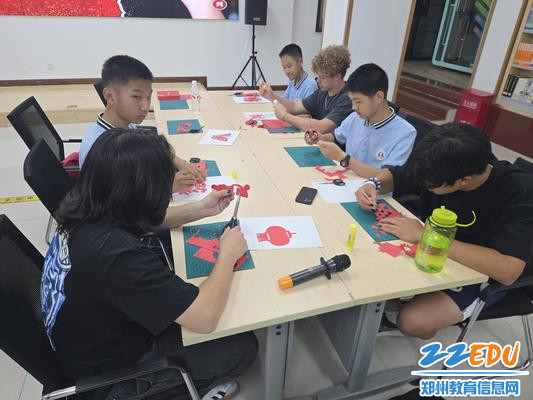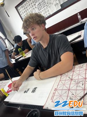 在剪纸工作坊,红纸翻飞间,交换生们在郑州八中学生的指导下,小心翼翼地剪出灯笼、孔雀、鞭炮等。当作品展开时,美国学生惊喜地说:“这简直像魔法!”书法体验环节则更显文化底蕴。郑州八中学子以英语讲解中国书法的千年历史,并示范篆、隶、楷等字体。圣玛丽高中的学生手握毛笔,在宣纸上写下“福”字,他的搭档竖起大拇指:“你的握笔姿势很有天赋!”