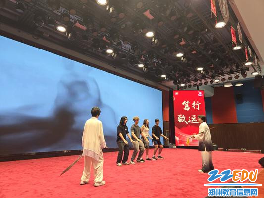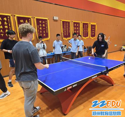 中国舞表演将活动推向高潮。郑州八中学子演绎的《万疆》和《映山红》尽显东方韵味,美国学生沉浸其中。在校史馆,交换生们通过郑州八中学子的英语解说了解学校七十余载的办学历史,对“根文化”教育理念表现出浓厚兴趣。武术展示环节尤为震撼,太极刀表演刚柔并济,美国学生跟着比划招式,体验“以柔克刚”的哲学。最后的乒乓球友谊赛笑语连连,双方混合组队竞技,球台边围满加油的同学。