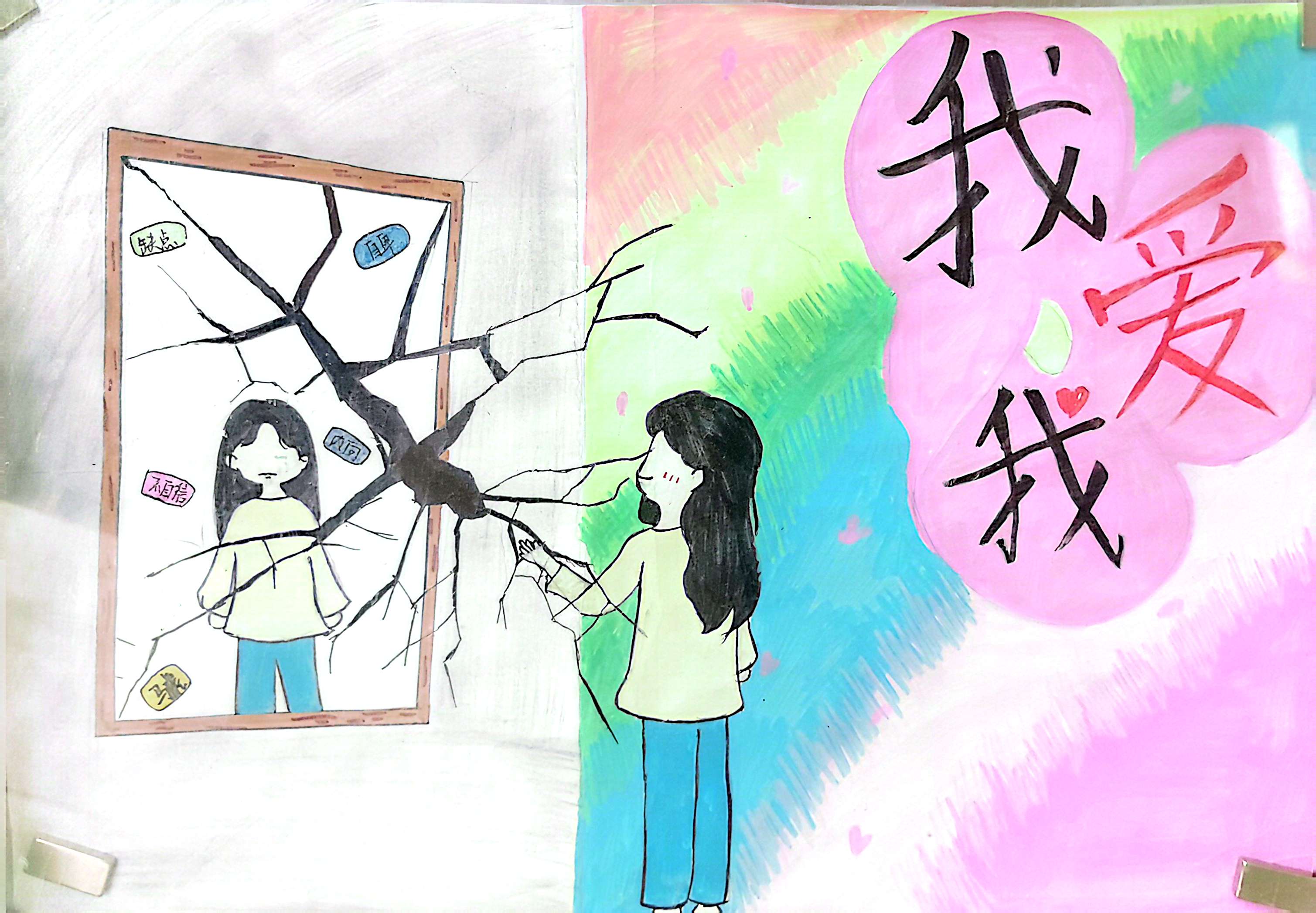 走进展览现场,仿佛踏入了一个充满奇幻与温暖的心灵世界。在六大主题作品中,同学们用细腻的笔触描绘出对自我的认知与接纳,有的作品展现了自己独特的兴趣爱好,有的则表达了对自身优缺点的坦然面对。