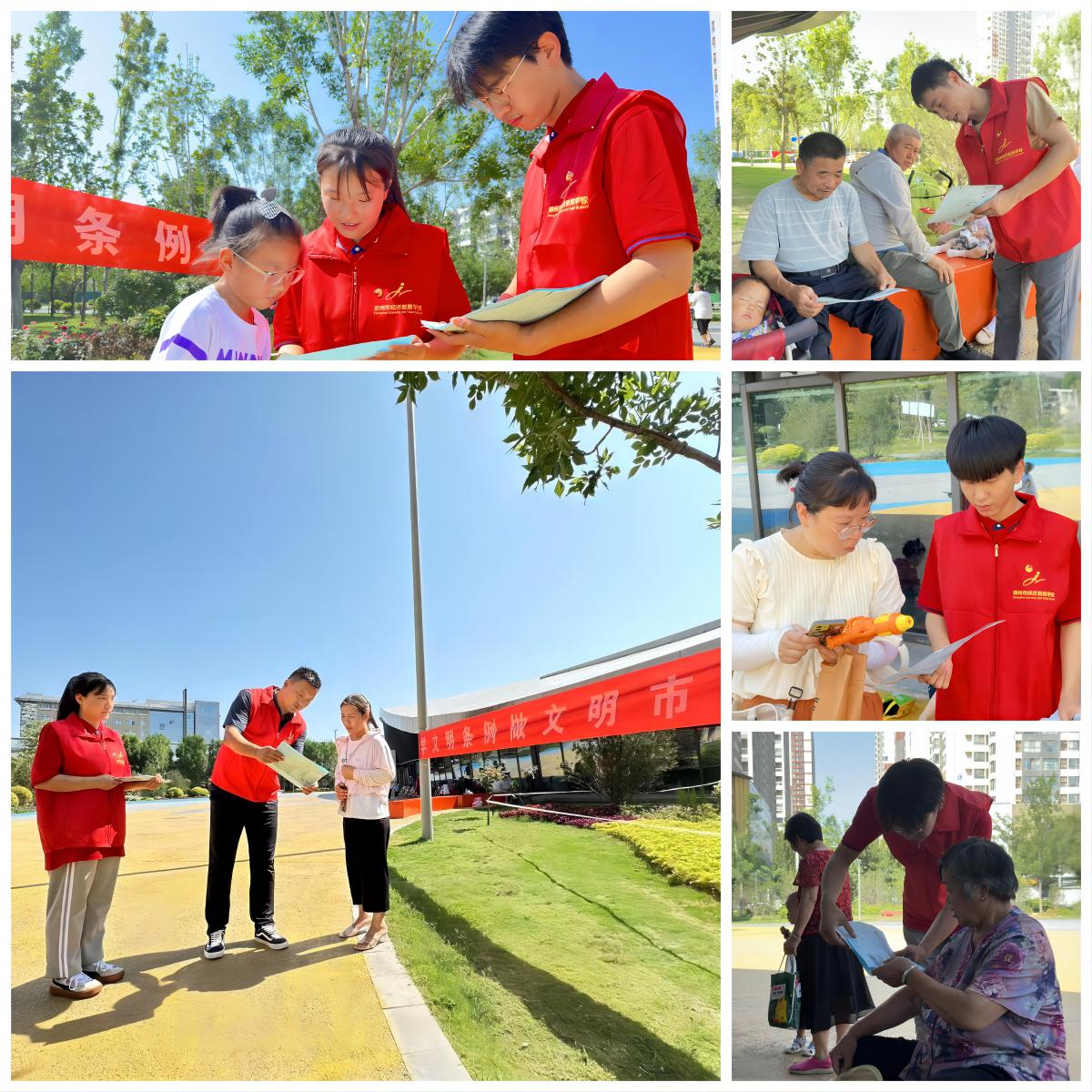 为通过实际行动践行《条例》,学校组织师生志愿宣传活动。6月30日上午,在郑州市经济贸易学校团委书记曹帅和总务处梁雪胜老师的带领下,该校学生积极投身于《条例》的宣传活动中。师生们用自己搜集到的文字和图片制作了宣传资料,并走进青年公园进行宣传。他们带着笑容和热情,向人们发放宣传册,同时还对老人及小朋友进行详细的讲解交流,通过有温度的形式向公众传递文明行为的重要性。