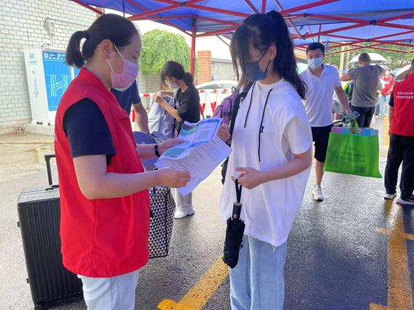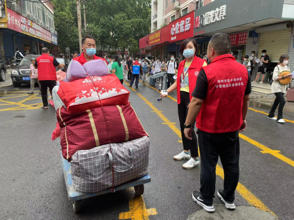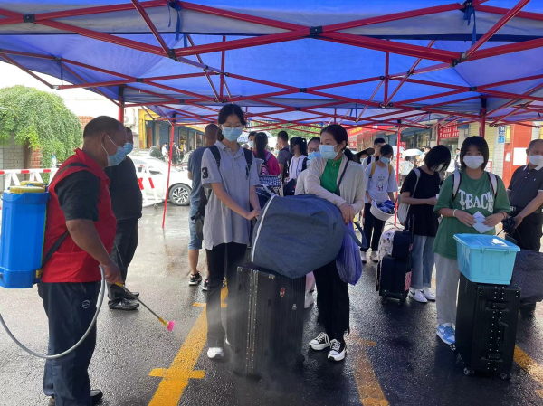 交通引导志愿者和联合执法部门在学校铭功路路口疏导交通,劝阻外来车辆停放,引导家长们指引路线、有序停车,极大程度地缓解了交通指引压力;校门口,志愿者为学生们耐心讲解入校流程,维持学生有序排队,注意间隔距离,收集学生的行程码、健康码和核酸阴性证明。学生们有序经过预设的入校通道,按照指引有序到宿舍。志愿者们从家长手中接过行李,统一用小推车送回宿舍,一趟接着一趟。这样既减轻了学生的负担又缩短了入校时间。站在校外的家长都纷纷称赞,感受到了学校的关爱和温暖。