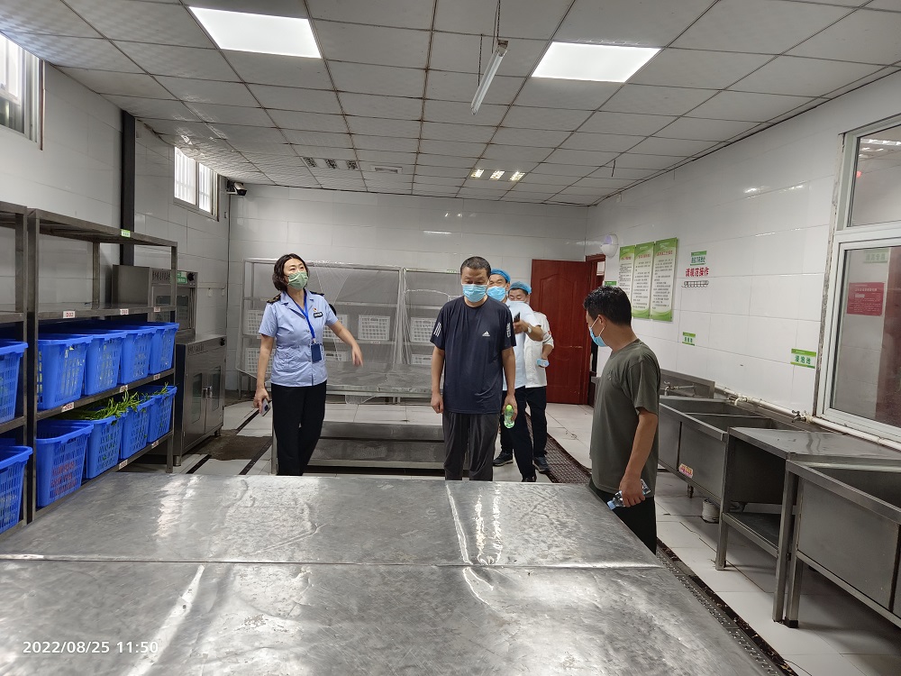 在检查指导过程中,赵珺详细询问食堂的各项准备工作、食品原料的采购途径和流程,以及食堂就餐环境和餐具的消毒消杀情况。之后,重点查看食品经营者资质、从业人员的健康档案、操作间环境卫生,以及贮藏间、食品加工间、食品留样柜的管理等情况。