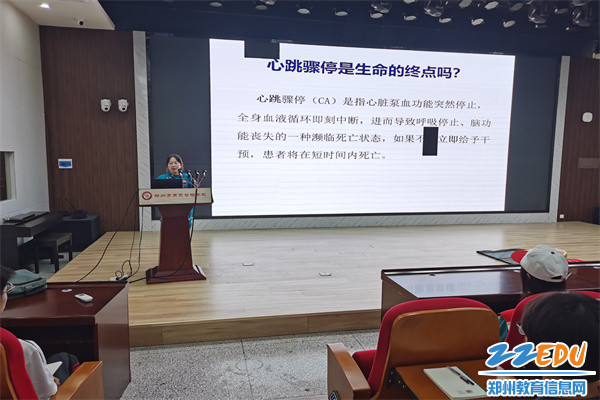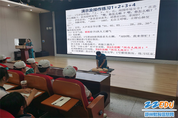 志愿护理服务队护师王悦首先给学生科普了遇到有人昏迷等紧急情况应该如何处置,给大家讲解了心脏骤停和呼吸道梗阻等紧急情况的特点,并使学生了解到学会心肺复苏和“海姆立克”急救法的重要意义,激发了学生强烈的学习兴趣,并在此基础上,给学生科普了心肺复苏和“海姆立克”急救法的科学用法。活动中,在医护人员的指挥下,全体参会学生亲自上手利用人体模型操作了心肺复苏和海姆立克急救法,医护人员耐心讲解并纠正学生错误手法,使学生真正掌握了正确的急救方法。