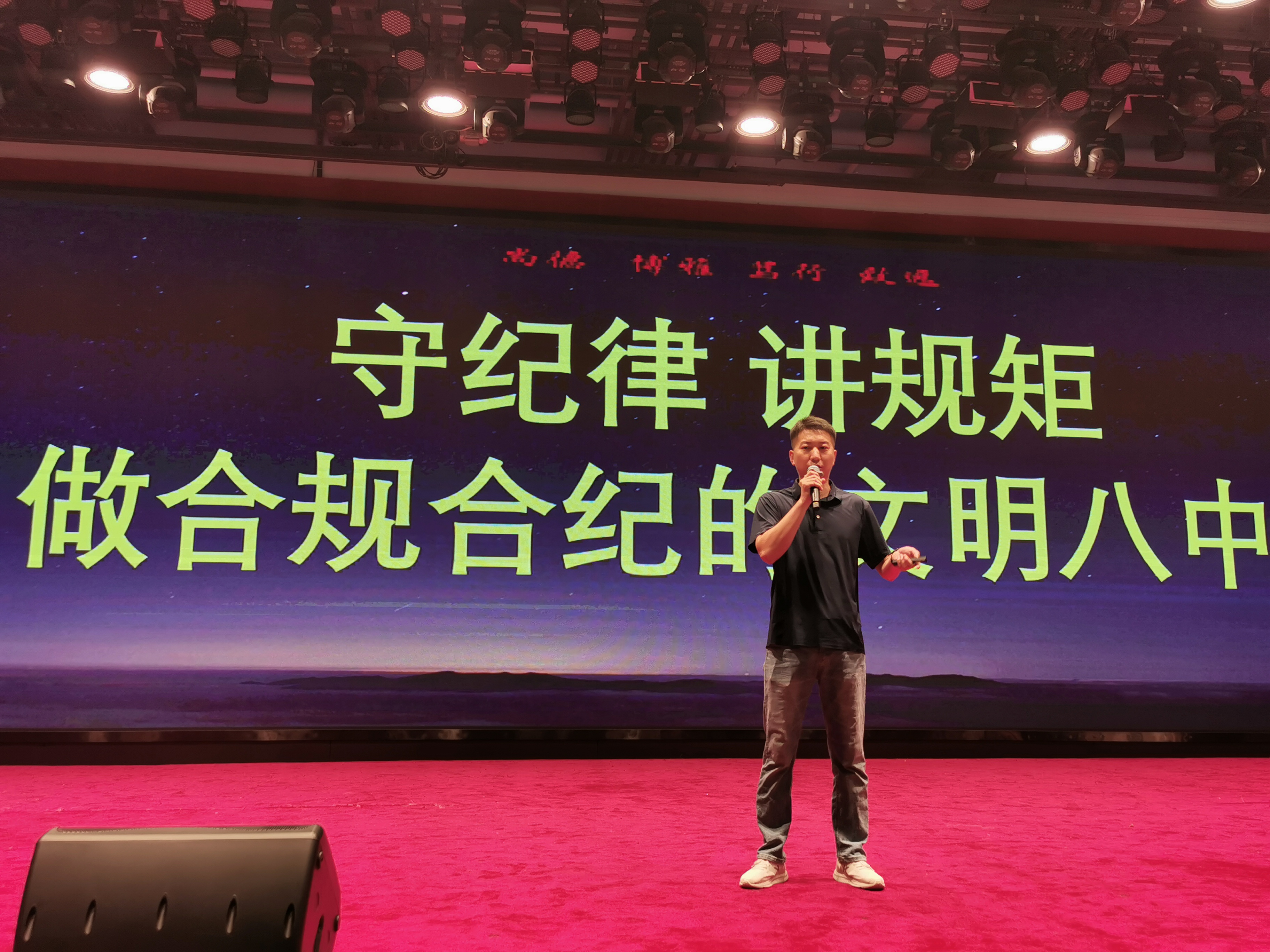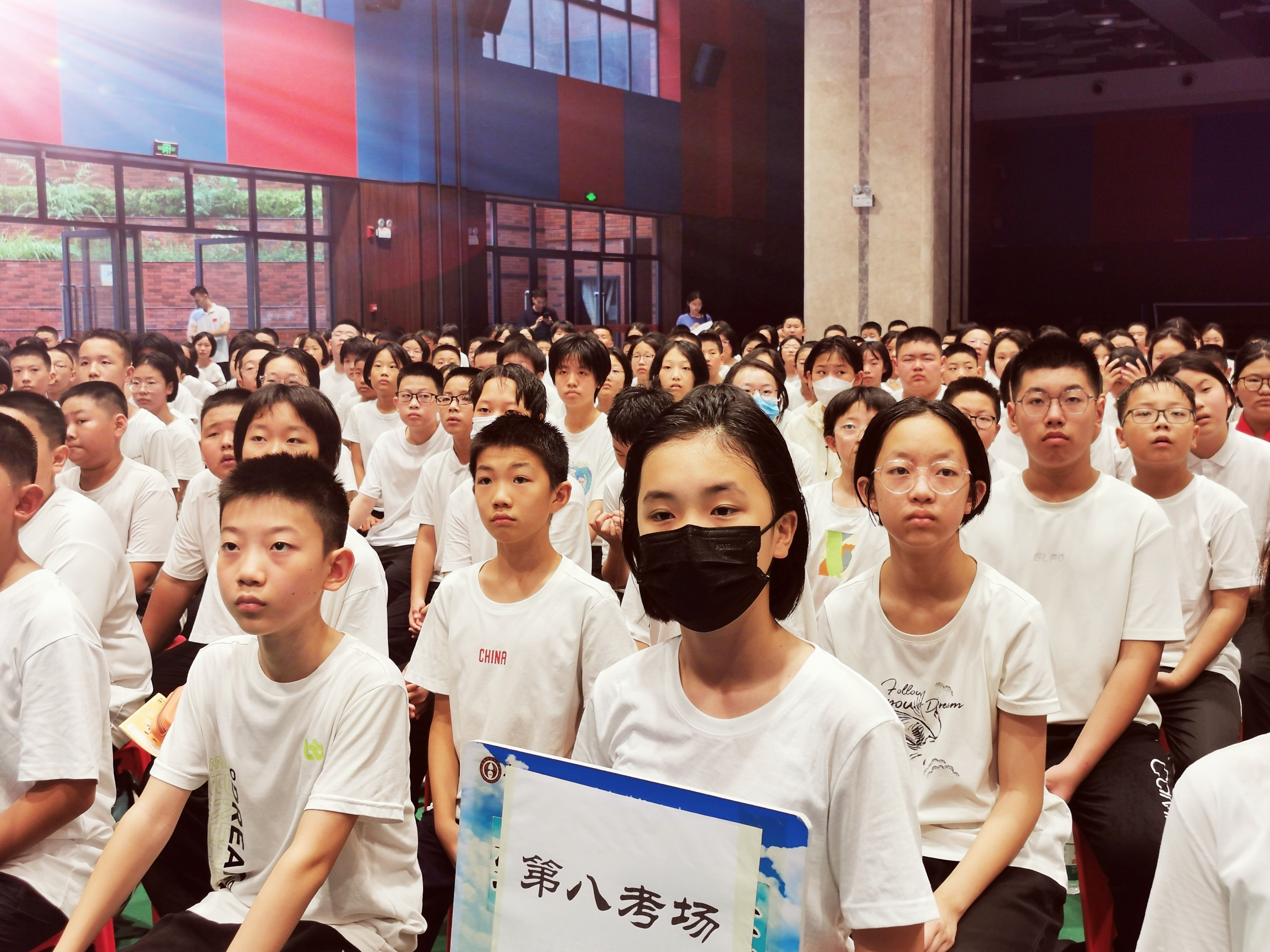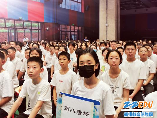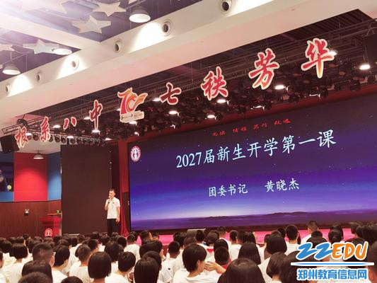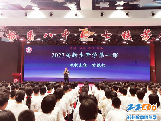 为增加同学们对学校的了解,知悉学校规章制度,尽快融入新的校园生活,8月24日下午14:30分,郑州八中地下体育馆内,2027届800多名新生列队而坐,端身正意,认真听取政教主任甘铁权、团委书记黄晓杰、政教处副主任孟祥艺一起为他们带来的别开生面的“开学第一课”。