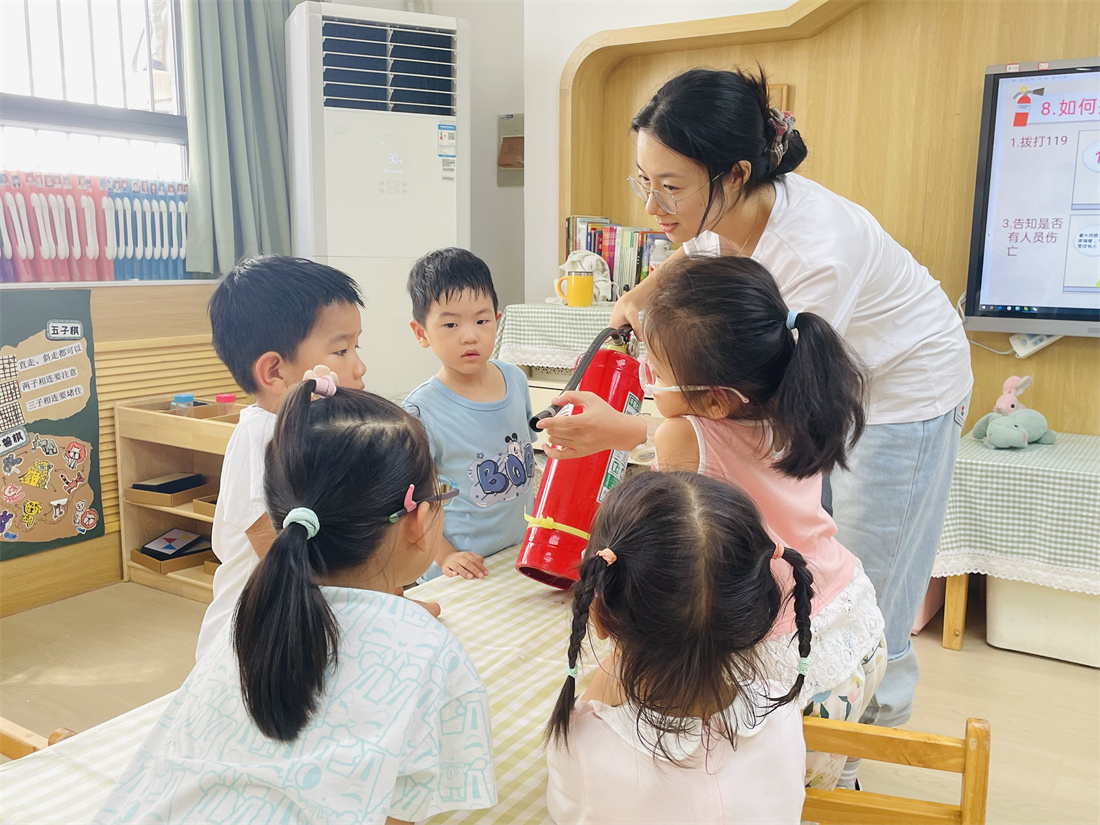紧接着,老师又通过情景模拟、亲身体验等浅显易懂的形式帮助孩子们了解到生活中必备的消防安全知识,包括正确的逃生方法、如何应急避险等。孩子们在老师的指导下近距离地观察灭火器,了解灭火器的功能及使用方法。同时,老师还带着孩子们熟悉了校园安全逃生路线图,了解到安全逃生基本要领。