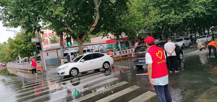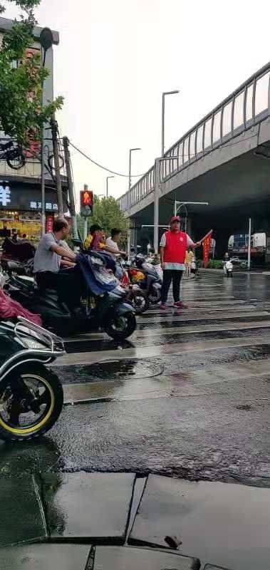 2019年8月14日下午2点,受台风影响又一场暴雨来袭郑州,给郑州市民出行带来诸多不便。下午两点三十分,瓢泼大雨中,郑州五中高一1班班主任谷冰冰带领学生丁浩、刘炬桓在陇海路新郑路交叉口路东南角开展志愿服务交通执勤活动,增添一道靓丽风景。