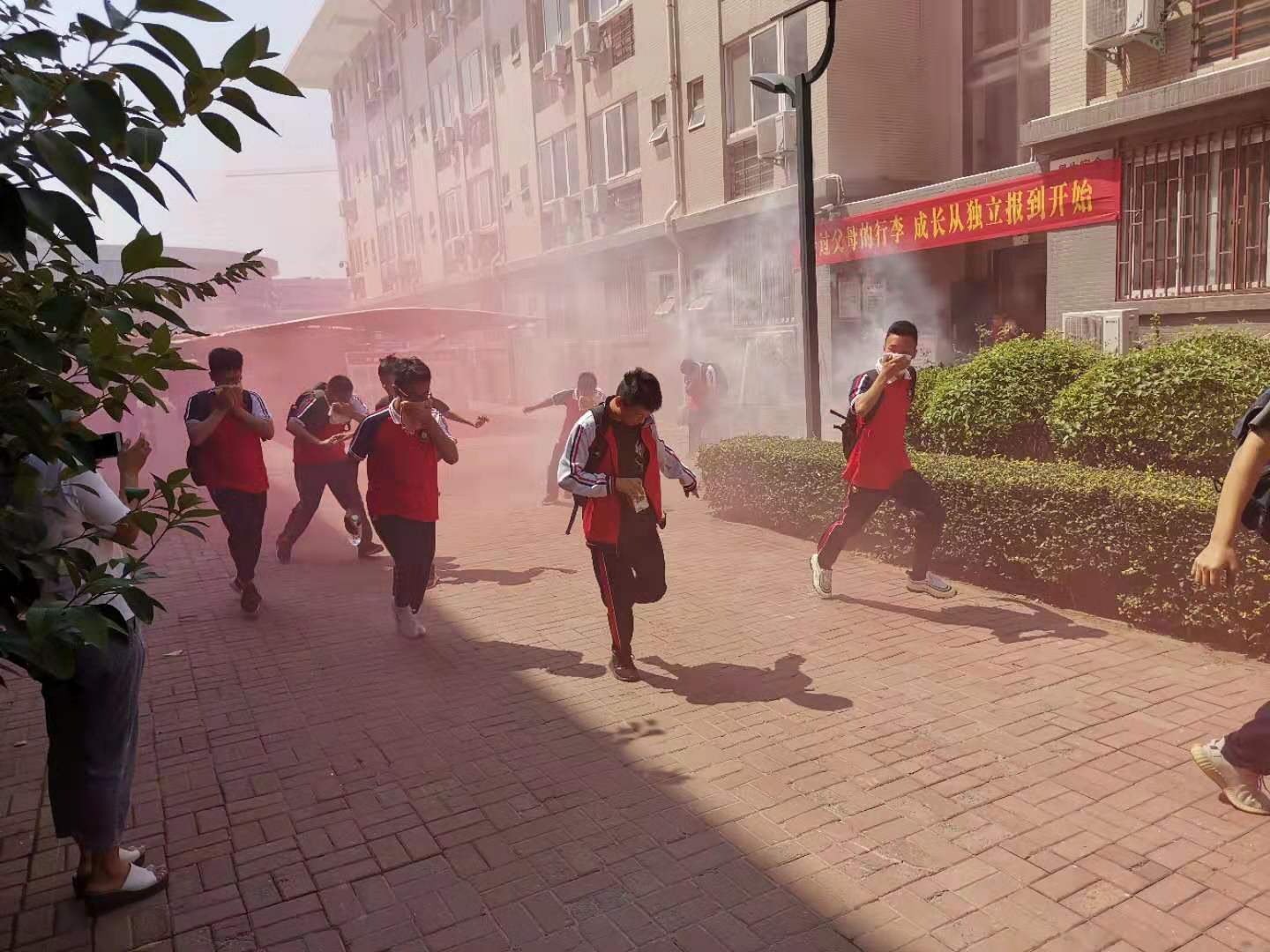 8月15日下午2点,郑州七中高中部的校园内响起了警报声,同时学生公寓门口燃起了烟雾弹,正在公寓午休的同学们用小方巾捂住口鼻,按照指定疏散路线有序迅速逃离到国旗广场,并由各班教官清点人数,确定所有人安全撤离。