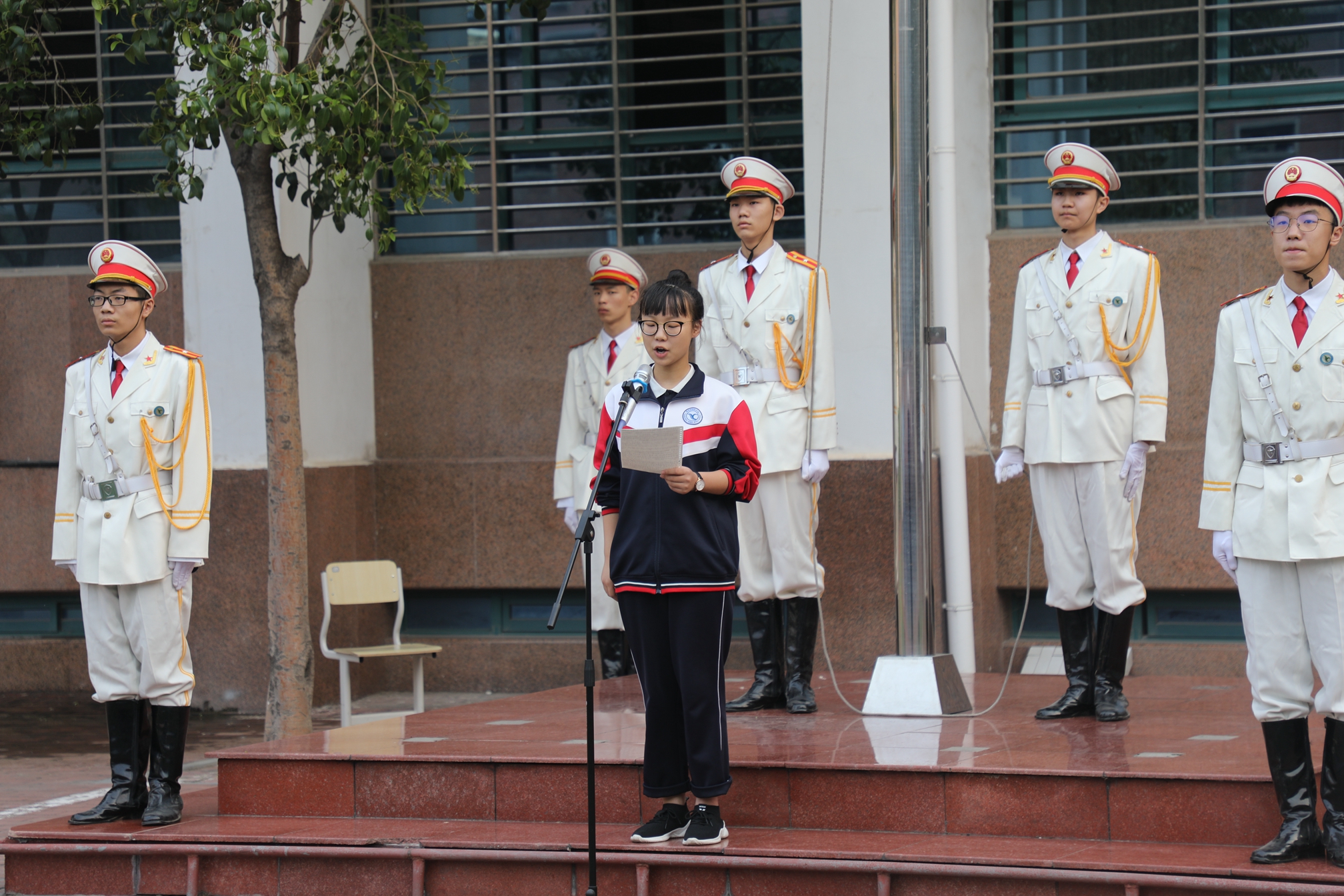 早晨6:50,升旗仪式正式开始。在全体师生的注目礼下,英姿飒爽的国旗护卫队队员们护送鲜艳的五星红旗进场,伴着庄严嘹亮的国歌,五星红旗冉冉升起。全体师生怀着激动与喜悦的心情,凝视着飘扬的五星红旗,内心无比自豪。大家举起拳头,庄严宣誓“忠于祖国,为祖国服务!”