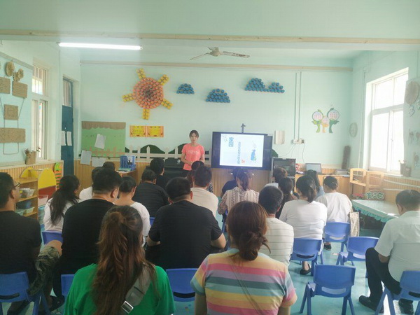 会议在庄严的国歌声中开始,郭玉聪副园长结合学校宣传片及多媒体课件,从幼儿园发展理念、师资队伍建设、安全教育、饮食午休、教育教学、入园前的准备等内容,向家长做了详细汇报;潘主任做总结,向家长提出思想及言行的要求与建议。