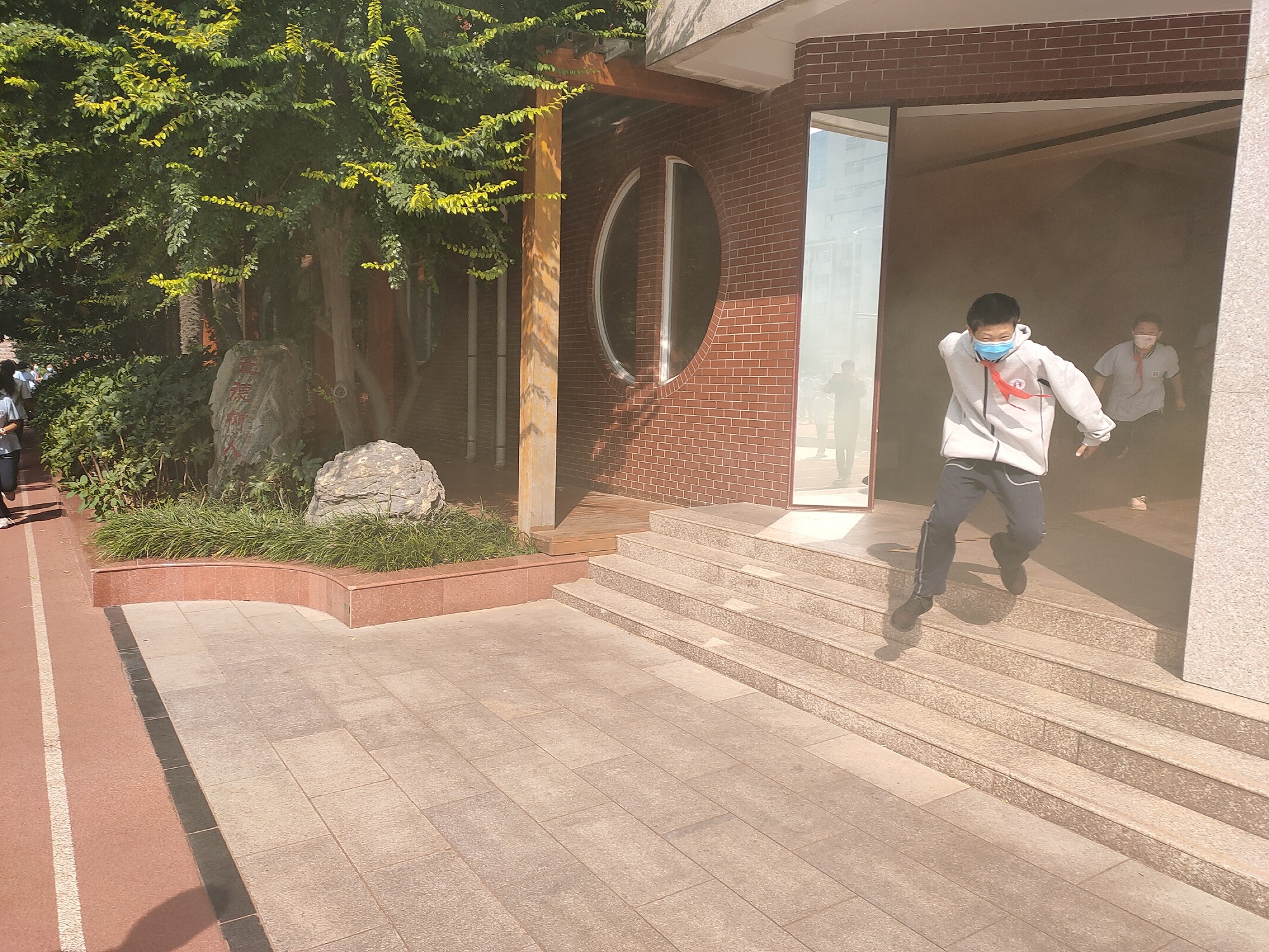 上午9点45分,疏散演练正式开始,各工作人员到位,随着总指挥贾鹏发布发现火情紧急逃生的指令,各班学生用湿毛巾或手肘遮掩口鼻弯腰从教学楼跑下来,在老师的指挥下,他们快速安全地到达了开阔的操场,各班教师迅速清点人数并向总指挥汇报了撤离情况。