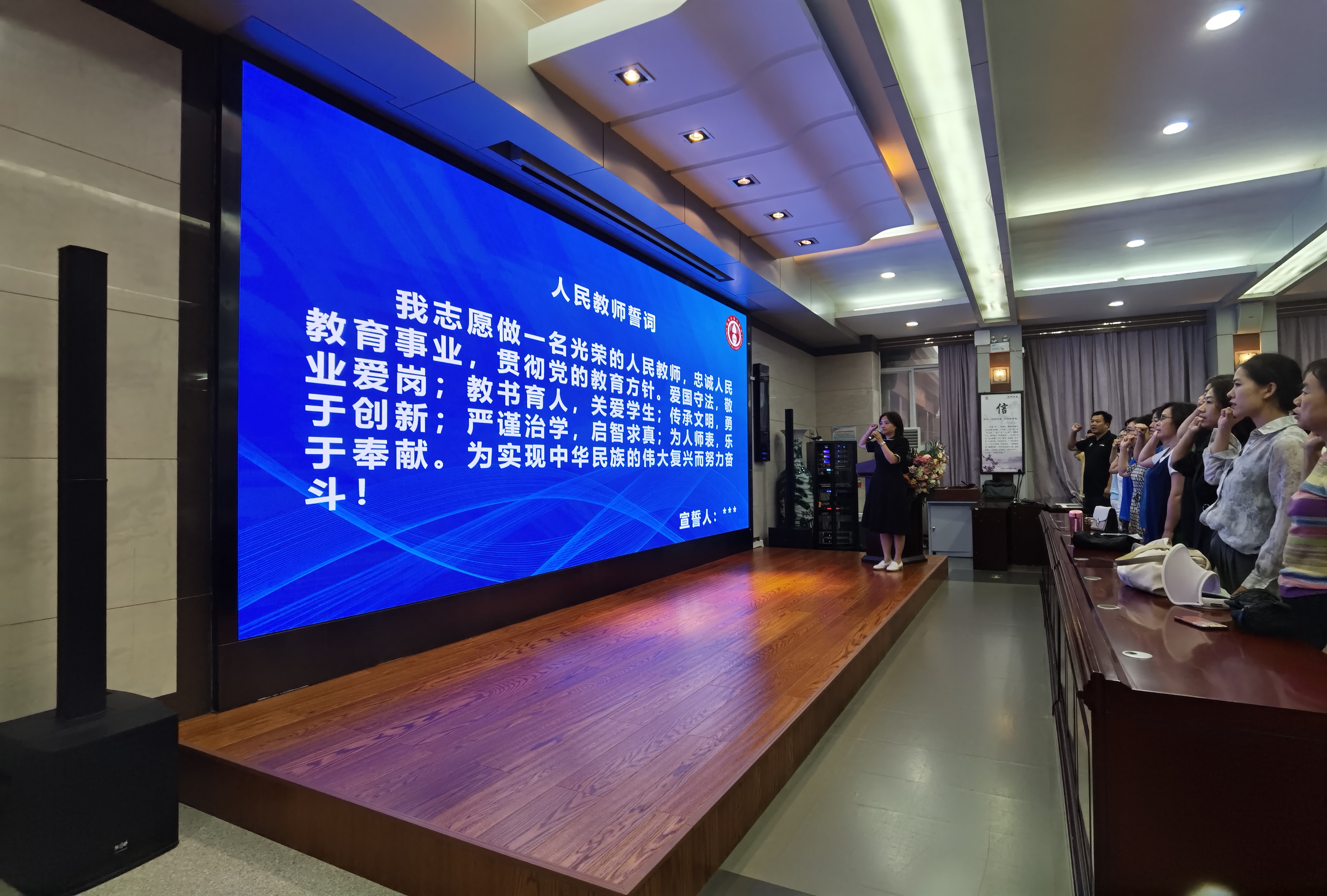 随后,郑州八中副校长刘莘带领全体教职工深入学习《郑州市中小学违反职业道德行为处理实施细则(试行)》,引导教师自省自警,并开展警示教育,以教育部网站公开曝光的7起违反师德典型案例为反面教材,告诫老师们要坚守师德底线。郑州八中副校长雷炀带领全体教师一起庄严宣誓,重温人民教师誓词,激发全体教师立德树人的崇高使命,做到学高身正,行为示范。