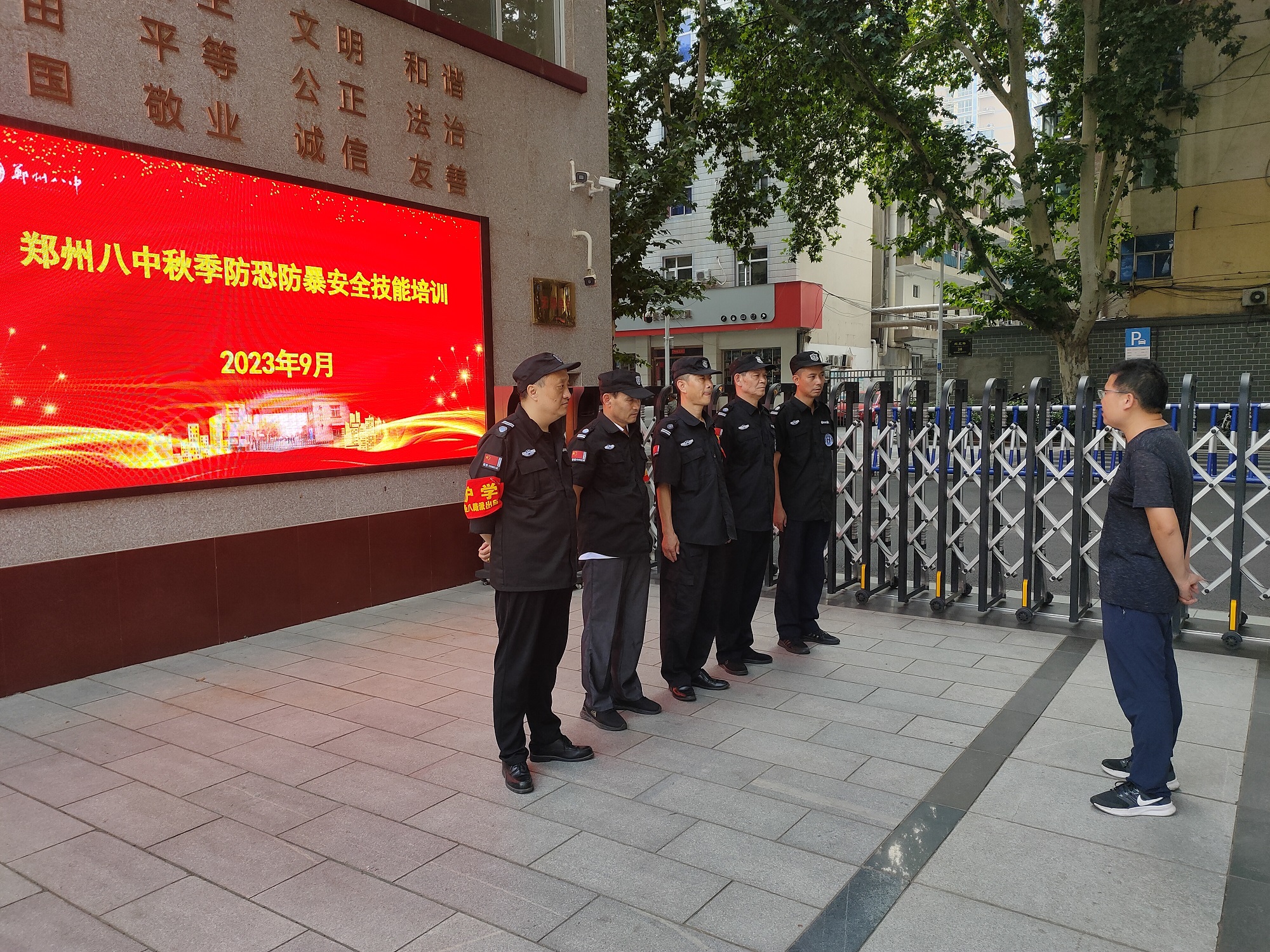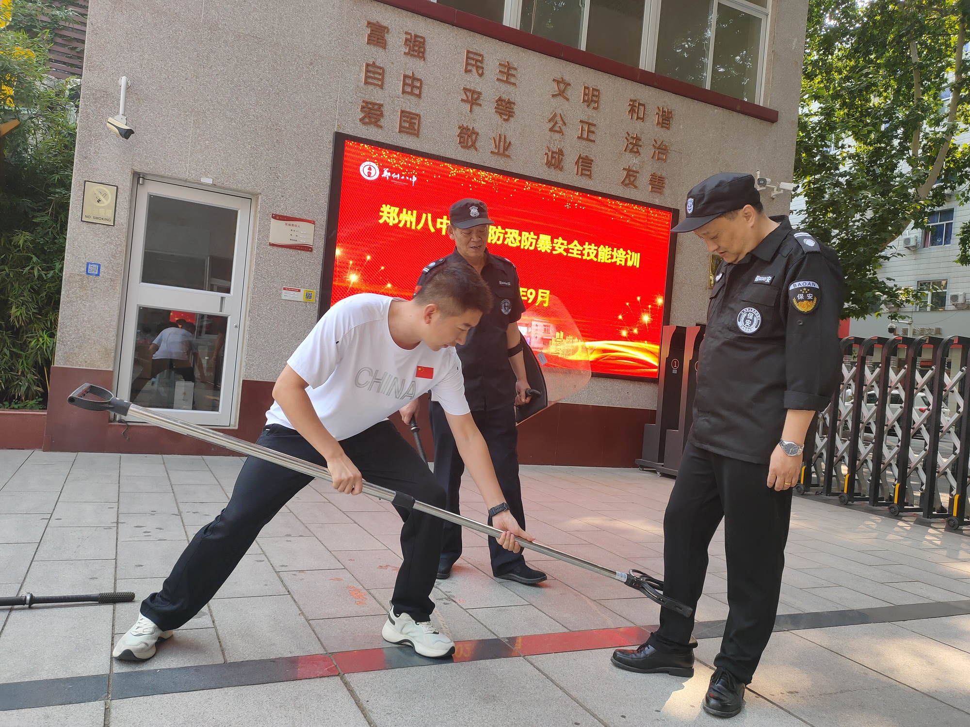 为提高学校安保人员和师生应对突发事件的能力,区教育局秋季校园安全大检查来临之际,9月6日上午,郑州八中开展防恐防暴安全技能培训,学校政教处副主任甘铁权、团委书记黄晓杰、总务副主任王旭阳、安全专干孟祥艺及学校保安人员参加培训。