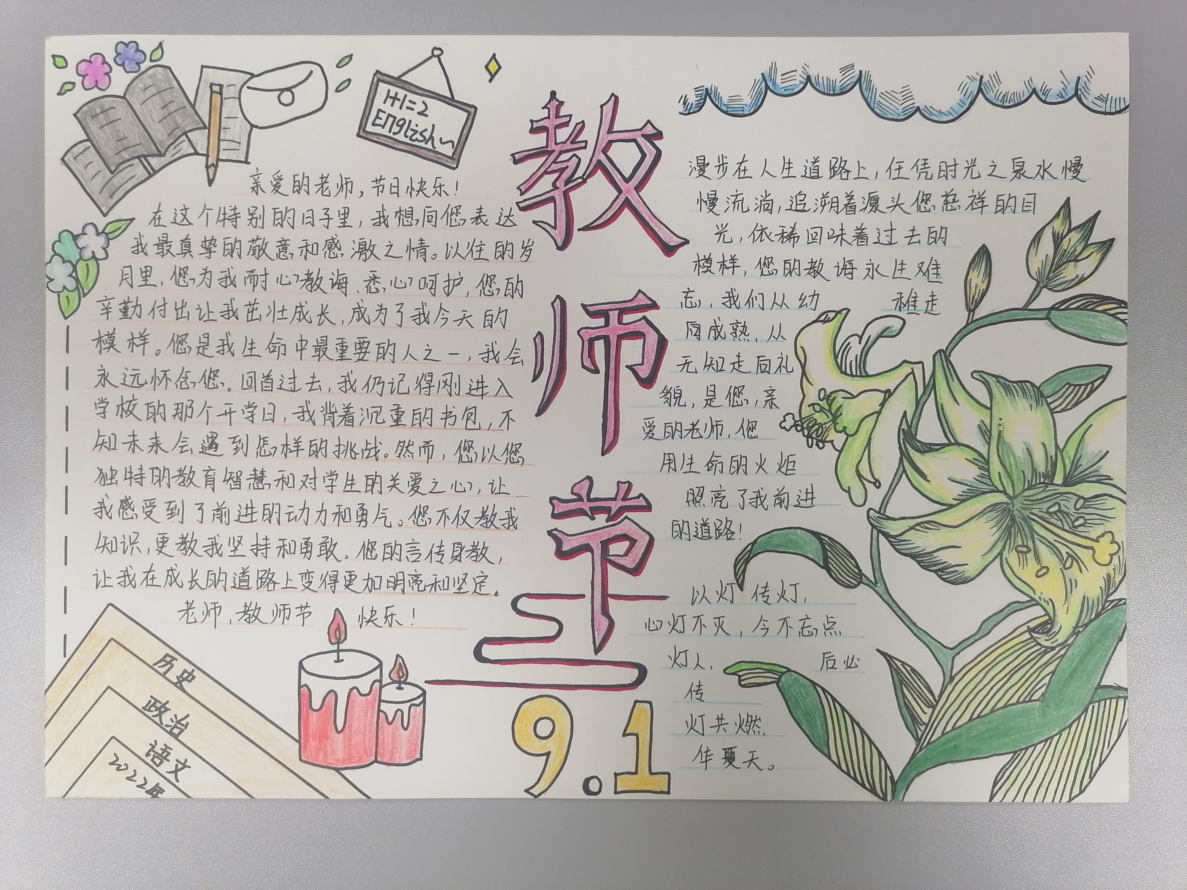 9月7日,郑州市财贸学校组织了教师节手抄报评比活动。同学们用心描绘出对老师最真挚的感谢和祝福,一幅幅色彩斑斓、充满童真的画作,无不体现出同学们对教师职业的敬仰和对老师们的感激之情。这些手抄报作品将在校园内展出,向全体师生传递着浓浓的师生情谊。