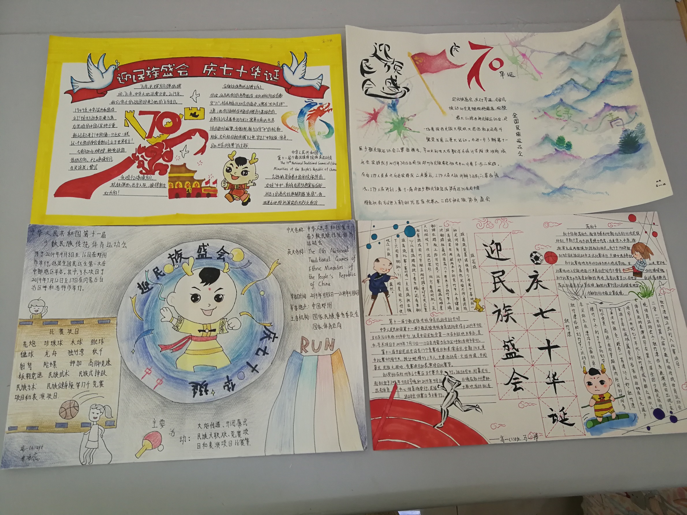 同时,同学们举办了以“迎民族盛会 庆七十华诞”为主题的手抄报,同学们发挥自己的特长,把自己对民族运动会美好的祝福和对祖国的热爱,通过手抄报表达出来。