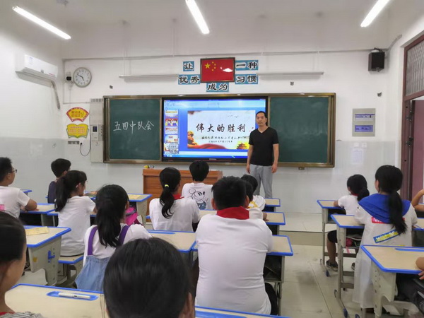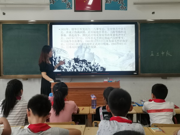 各中队组织召开以“牢记历史振兴中华”主题队会,通过观看抗日影片、学唱抗日歌曲、讲抗战英雄故事等方式,让学生从中进一步了解历史,培养学生爱国主义情感,增强民族自信心和自豪感。