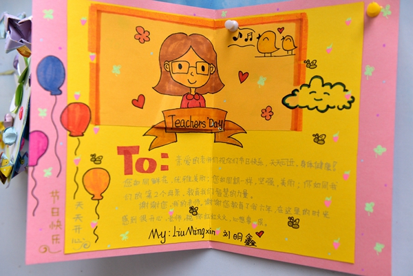 学校还举办了教师节贺卡比赛,同学们通过精心设计和打扮,一张张普通的卡纸变成了色彩斑斓的贺卡。“老师,您像太阳,照亮着我们,温暖着我们,我长大后也想做一名像您一样的老师。” “老师,谢谢您一路陪伴我们成长”……一张张小小的卡片,传达出的是学生对老师深深的依恋和浓浓的爱意。