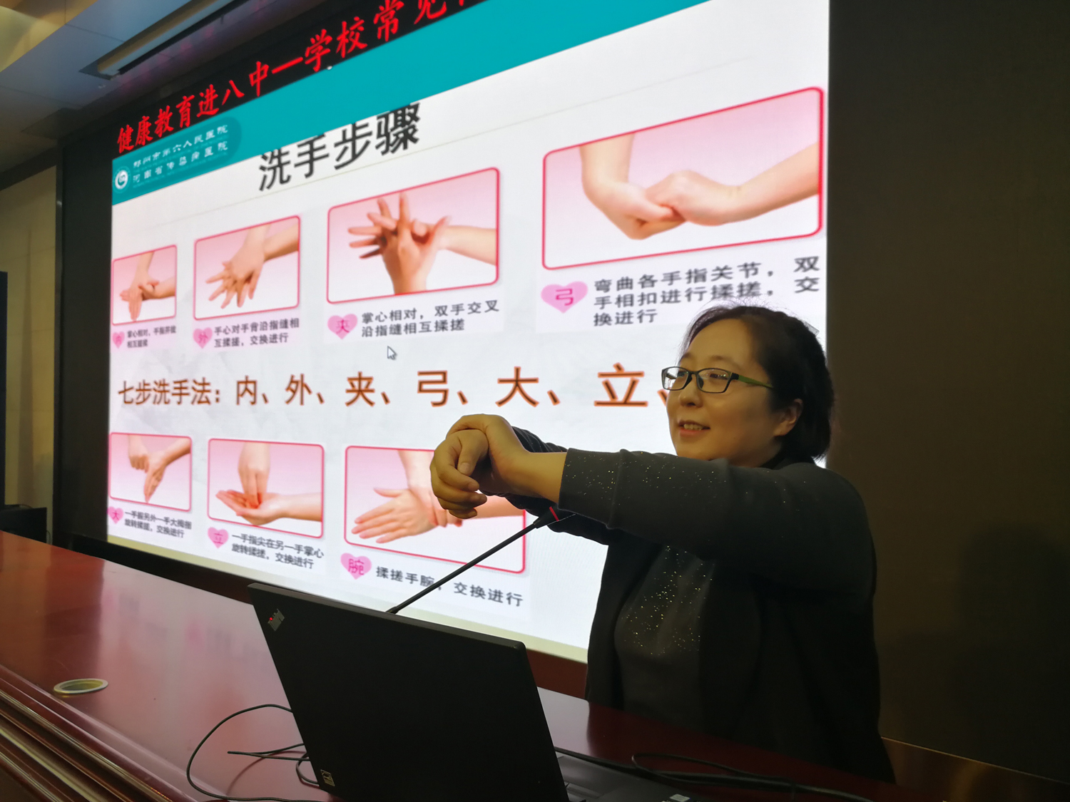 讲座的最后,刘瑜医师结合自己在传染性疾病的重症抢救和诊治中的案例,再次告诉学生对传染病预防的重要性,并向学生介绍了内、外、夹、弓、大、立、腕等七步洗手法。