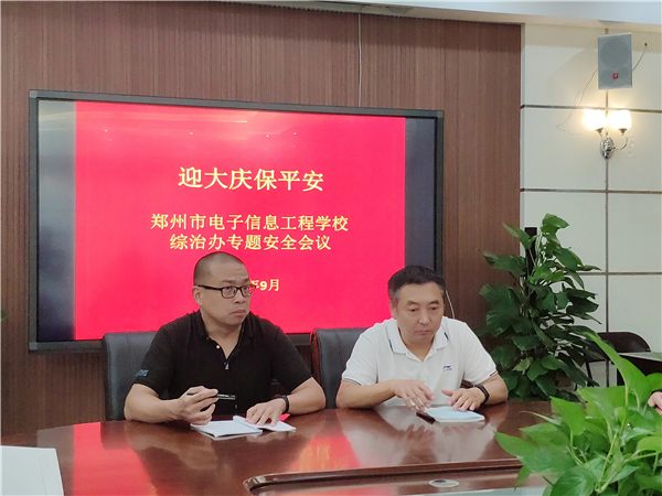 为落实省教育厅制定的《全省教育系统深入开展“防风险除隐患保平安迎大庆”行动方案》,确保国庆期间的校园安全环境,9月24日下午,郑州市电子信息工程学校综治办召开安全专题会议,组织校内全体安保人员安保工作。会议由副校长焦火锡主持,该校综治办主任苗畬、教师苗雨阳、韩真及全体安保人员参会。
