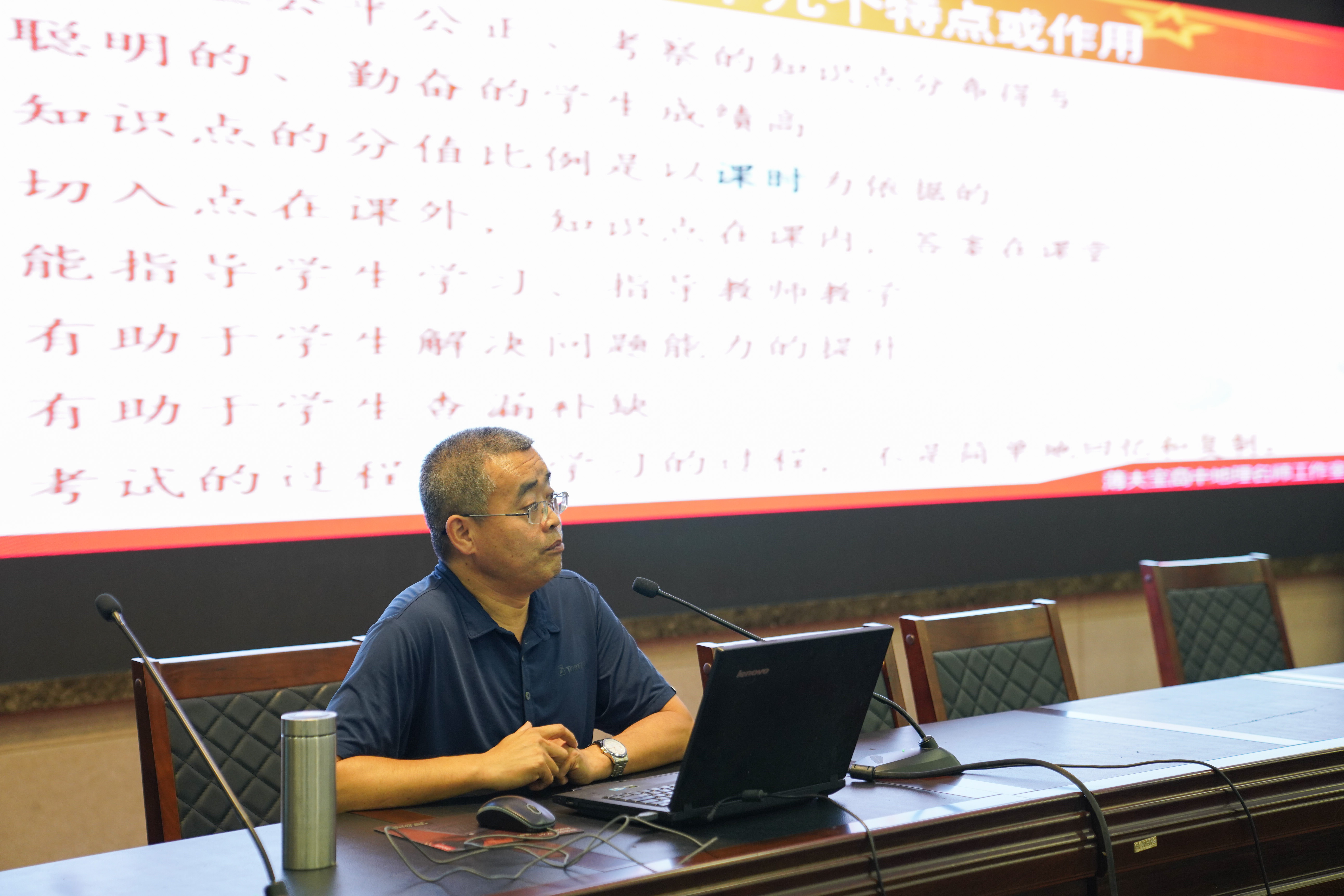 薄夫宝老师以《基于标准的教学评价——试题命制交流》为主题,针对教学评价设计进行讲授,结合近三年来的高考真题,总结归纳,就命题所涉及的知识、理论及能力等多个维度进行分析,从课程标准、考试性质等多个方面着手,确定命题的内容、方向。并通过将双向细目表与估分表进行对比,探寻方法,查摆问题,明确方向。同时也分享了优秀的原创例题与较为成功的改编例题案例。以地理学科命题为切入点,结合郑州31·103中长期以来所倡导的“全学科阅读”,薄夫宝老师通过生动形象的语言描述与具体详细的案例分析,让在场的各学校各学区各学科教师都有所思考,有所收获。