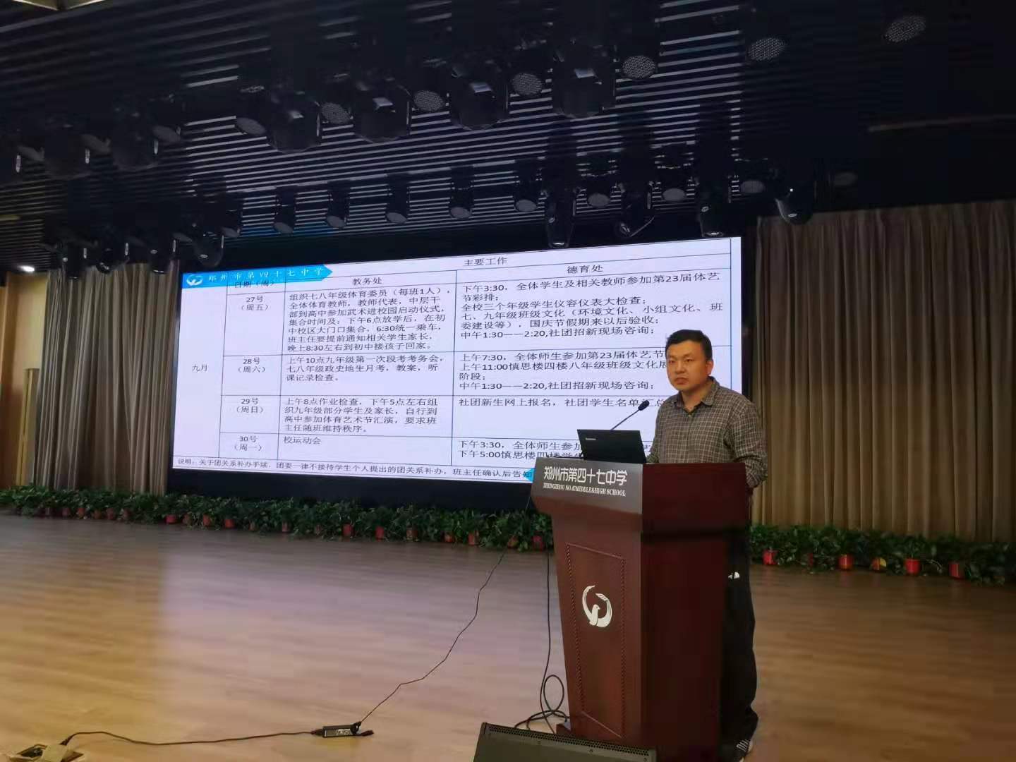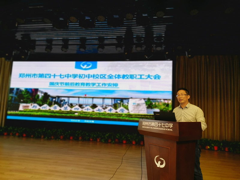 十月芙蓉花满枝,天庭驿骑赐寒衣,华夏七十岁月秋,山河瑞彩耀神州。时值祖国母亲70华诞,9月26日,郑州47中初中校区全体教职工齐聚一堂,落实国庆节前后教育教学工作安排,从细节入手,将工作落到实处,充分表达了四十七中人对祖国的深情,对岗位的热爱。