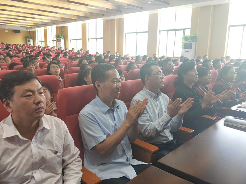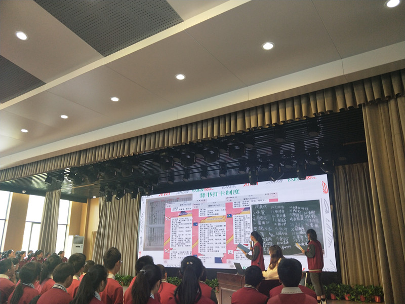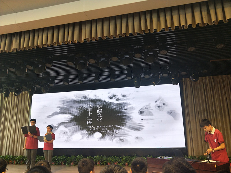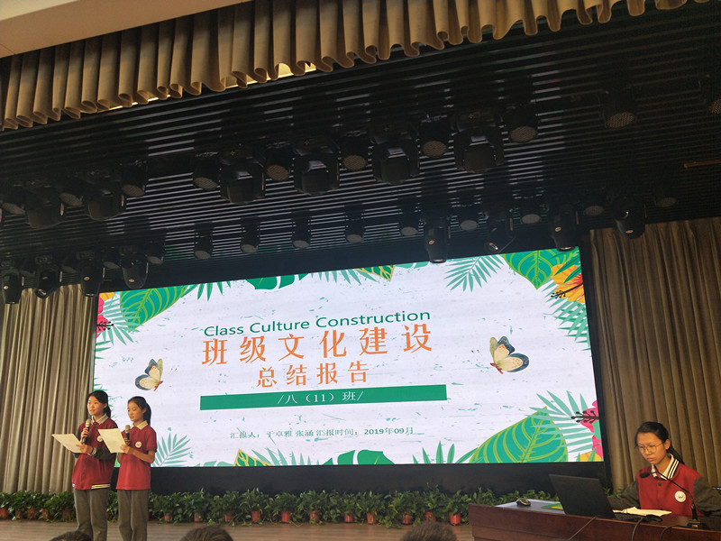 八年级年级长王建峰老师进行主持,他说:“班级文化建设是一个长期的、日积月累的过程,它所展示出的文化内涵就是一个班级的班魂,而落实班级文化建设就是落实我们的校魂——厚文化思想。”进入第三轮终选的八九班、八十一班、八十二班三个班级分别派出小小播报员通过PPT对自己班级的班名、班徽、班训、班规、班歌、小组文化、班级信仰、班级特色等向全体八年级学生进行了展示,秀出了自己的班级魅力和班级精彩,迎来了掌声阵阵。之后,通过评比,肖国红执行校长、马华林副校长、程雷副校长分别对这次班级文化展示活动中的获奖班级进行了颁奖。