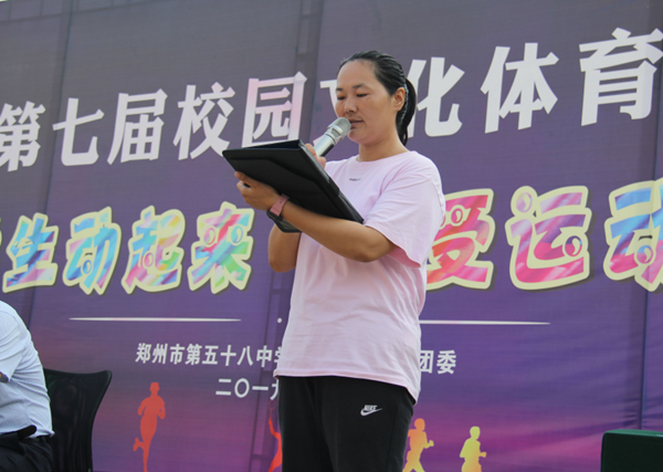 跑道上,准备入场的各班方阵精神抖擞,整装待发。校长董震大声宣布:郑州市第五十八中学第七届校园体育节田径运功会入场式开始!