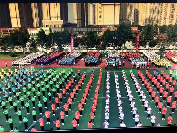最后,由七年级1300多名同学演出的《我爱你中国》燃爆会场。适逢祖国70华诞,同学们家事国事事事关心,他们在班级入场时上向祖国各种花式表白。此时,他们载歌载舞对祖国表白《我爱你中国》。伴着张宪波老师深情的歌声,同学们在操场上排成了五个大字:“我爱你中国”,把心中对祖国的爱与祝福写在绿茵场上。操场上空,两架无人机打出条幅:“我爱你中国。”“祝福祖国70华诞。”掌声、尖叫声潮水般涌来,58中人的心和着祖国的脉搏一起跳动。我们爱家爱校爱祖国,我们拼搏争先创未来。