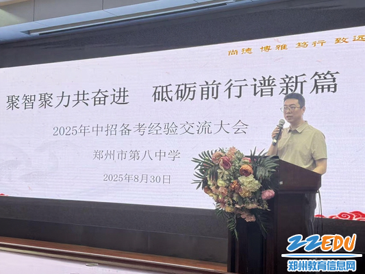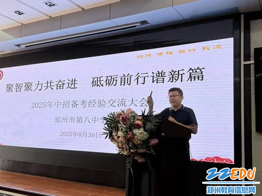 8月30日下午,郑州市第八中学2025年中招备考经验交流会举行。本次会议由郑州市第八中学教务处主任甘铁权主持,以“聚智聚力共奋进,砥砺前行谱新篇”为主题,旨在总结2025届中招备考经验,凝聚共识,为新一届中招备考工作指明方向。学校全体教职工齐聚一堂,分享智慧、交流心得,共同探讨提质增效的路径与方法,为新学期谱写奋进新篇章奠定坚实基础。