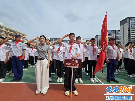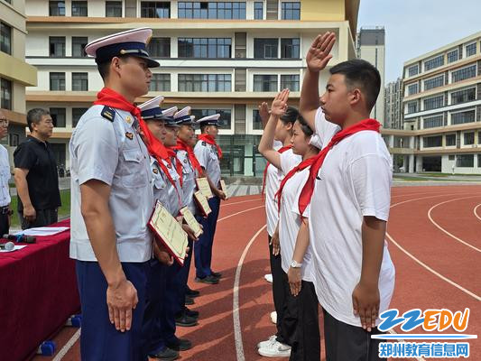 紧接着,学校领导为教官们颁发聘书,各班学生代表为他们佩戴上了鲜艳的红领巾,各班班主任老师郑重地将象征着团队凝聚力和荣誉感的班旗交到各班旗手手中……