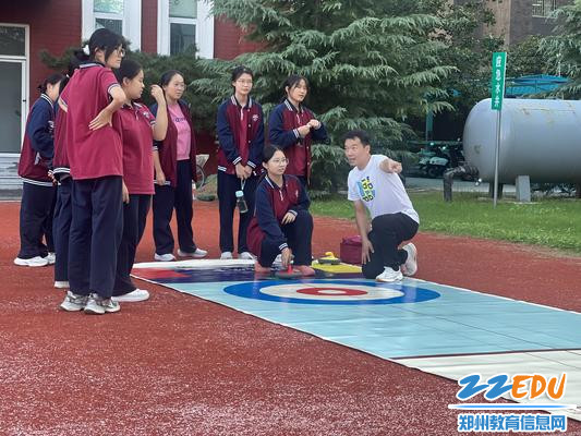 郑州市第十八中学陆地冰壶社团辅导教师为学生现场教学
