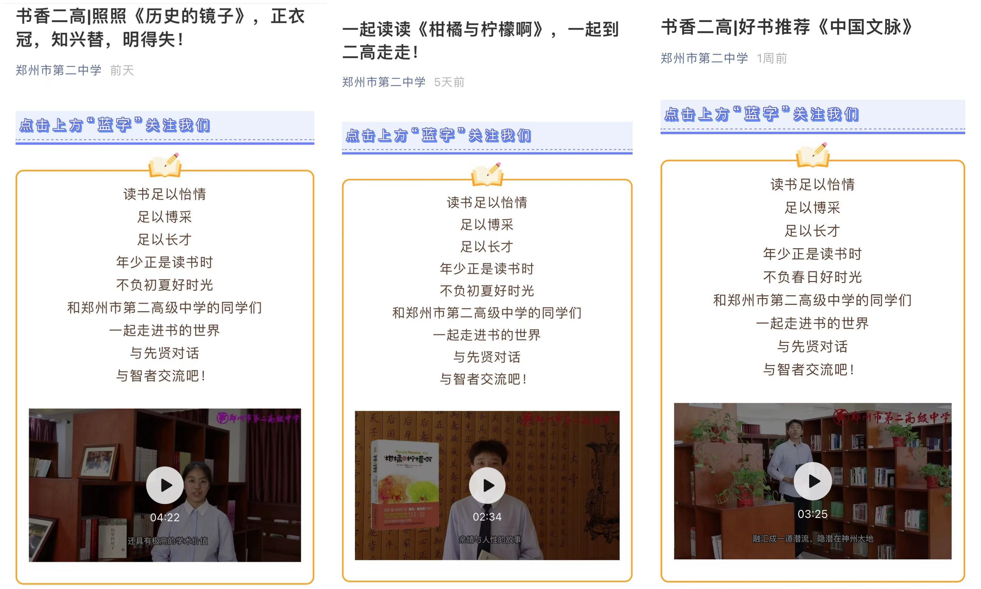 据悉,郑州市第二高级中学高度重视书香校园建设,现代化的图书馆、开放式读书堂、每层楼的老周书吧和班级内的读书角,让学生养成“好读书、读好书”的习惯。每周升旗时的“好书推荐”,每月阅读课分享,每季度写作比赛,每学期经典诵读,软硬笔书法比赛,常态的校园广播站、校报等为师生形成长期、广泛的读书习惯奠定良好基础。
