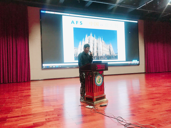 首先,学校AFS项目负责老师许晓辉向同学们介绍了这些年来参加AFS国际文化交流项目的学生;分享了AFS项目带给这些学生的变化以及他们的现状;并展示了正在意大利参加AFS国际文化交流学生麻芮发来的意大利生活学习视频。