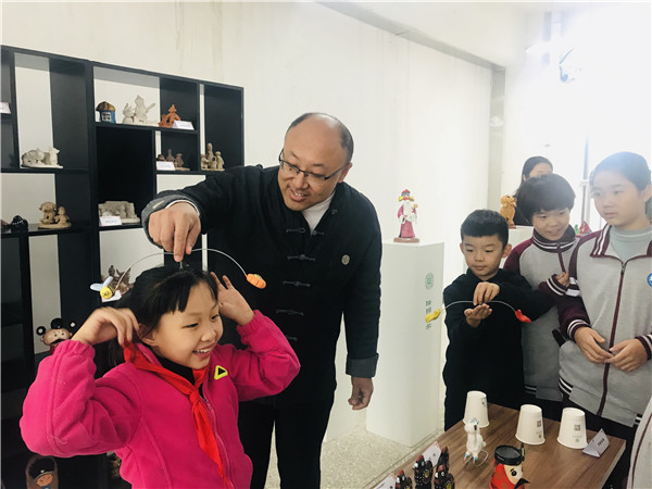 活动现场,瑞锦小学副校长、泥塑课程负责人王振明耐心的解答大家提出的和泥塑相关的问题,并开展了现场教学——教大家做呢哨。