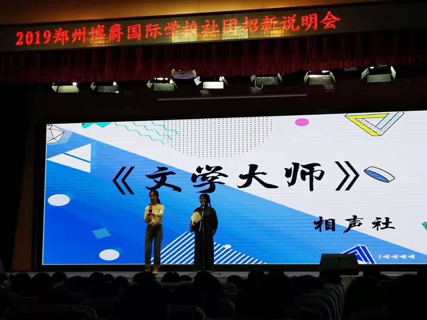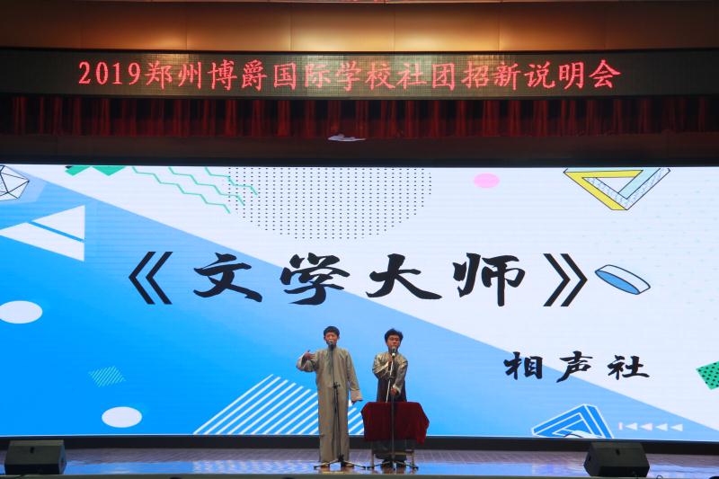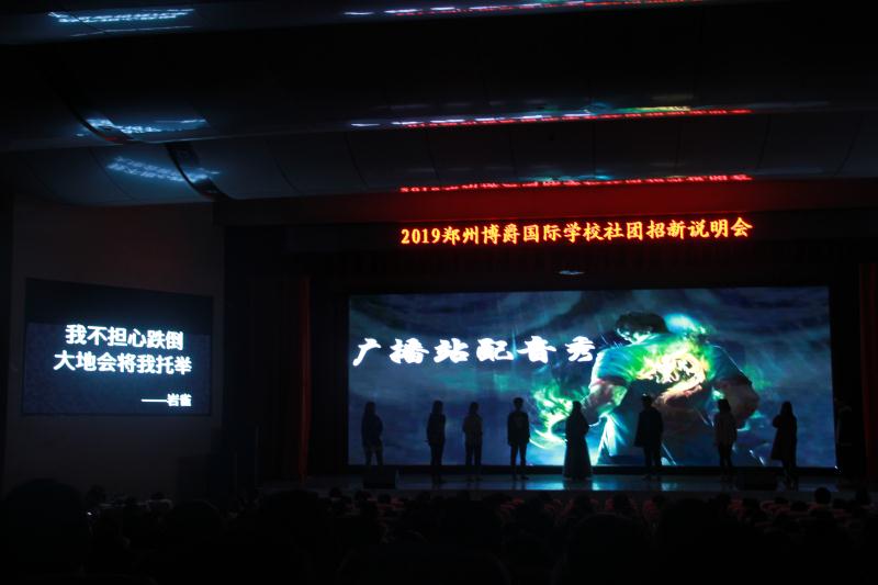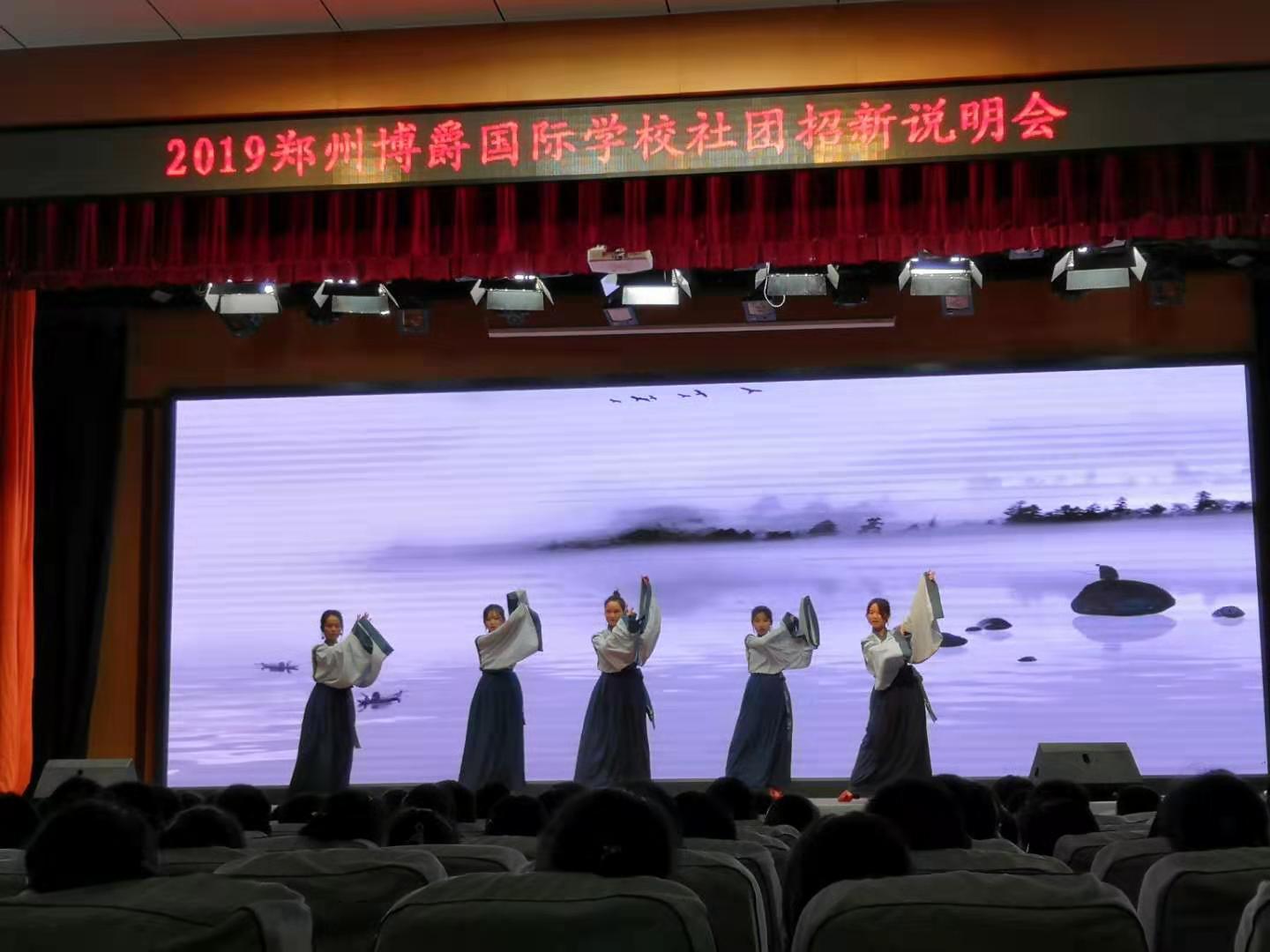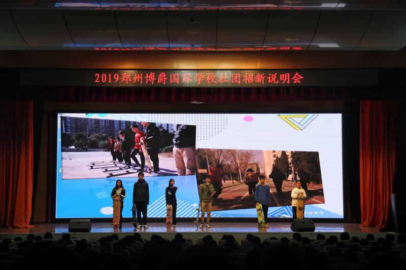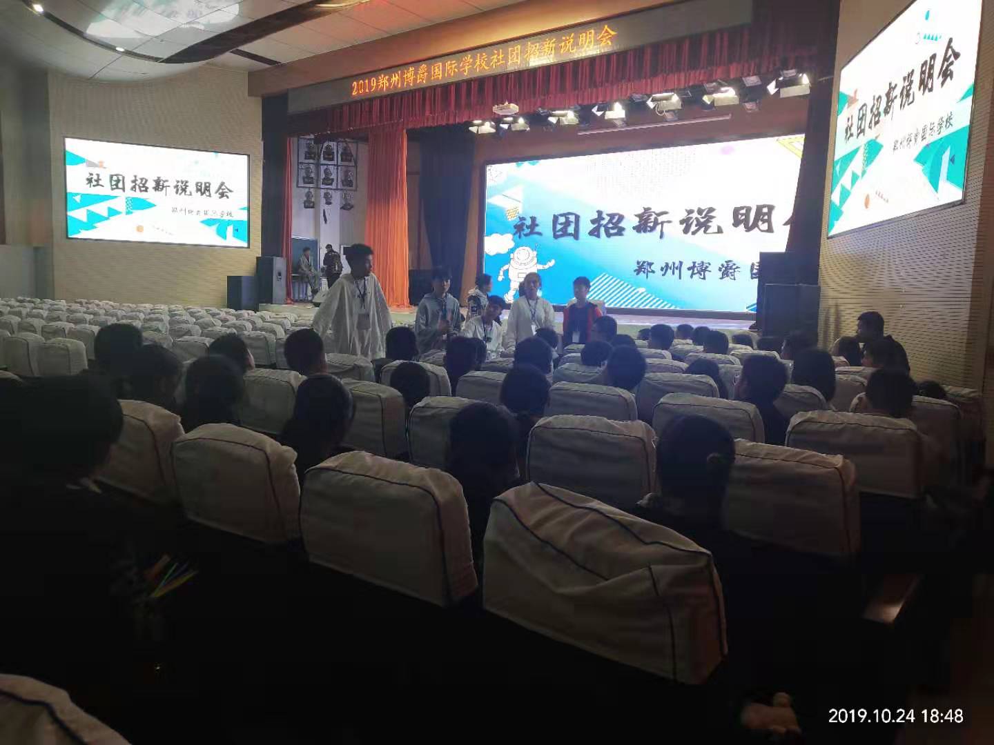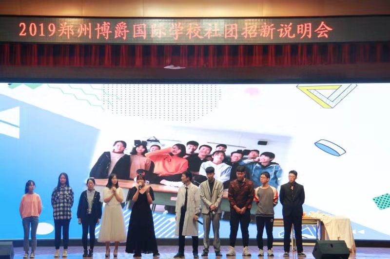 10月24日下午,为使高一新同学对学校的社团有更全面、直观的了解,郑州博爵国际学校举办2019年社团招新说明会,高一年级全体师生以及学校社团指导老师、主要社团干部参加了本次说明会。
