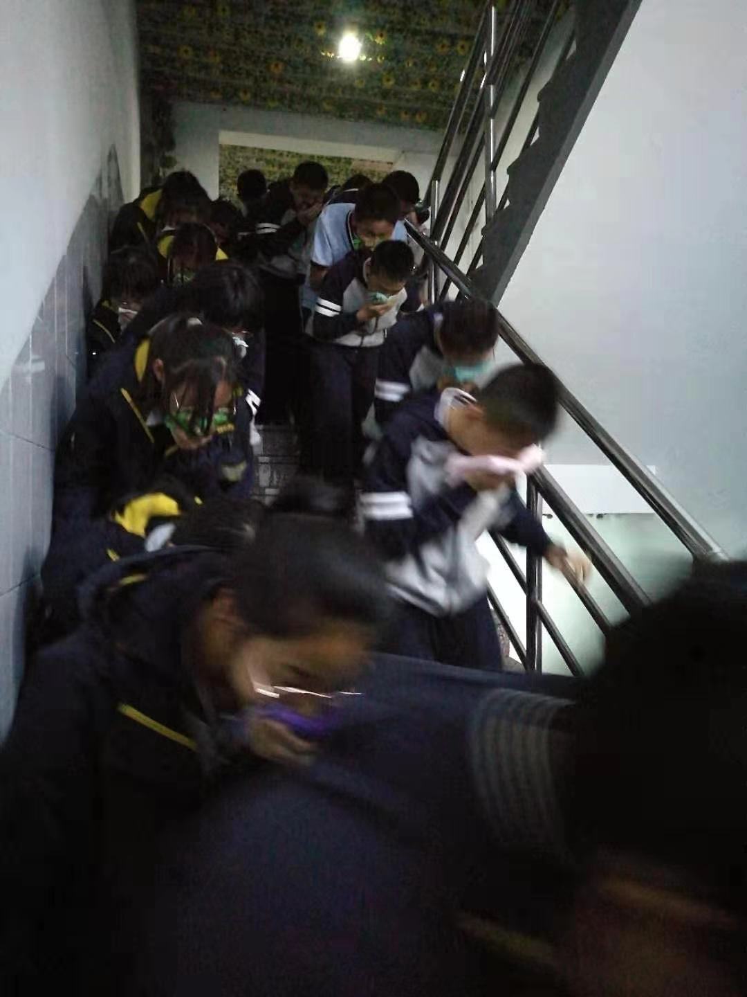 消防演练中有序撤离的学生们