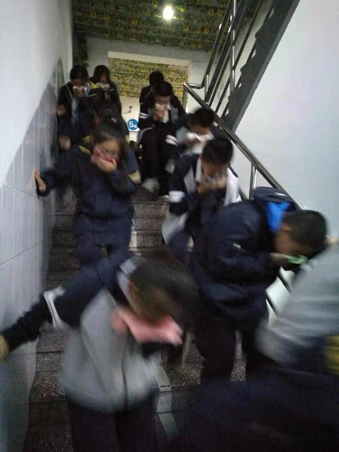 17:40分,随着警报声的响起,年级各楼层的负责老师第一时间赶到指定位置,协助学生快速、有序地撤离。各班班主任带领本班学生弯着腰,用湿毛巾捂住鼻口,沿指定路线迅速撤离至安全地带。每一楼层均有一名老师负责监督,避免学生演练时发生踩踏事故,同时也协助学生队伍快速、有序地撤离。所有师生都能做到有秩序,行动快速,配合默契。不到3分钟时间,八年级全部师生安全撤离。