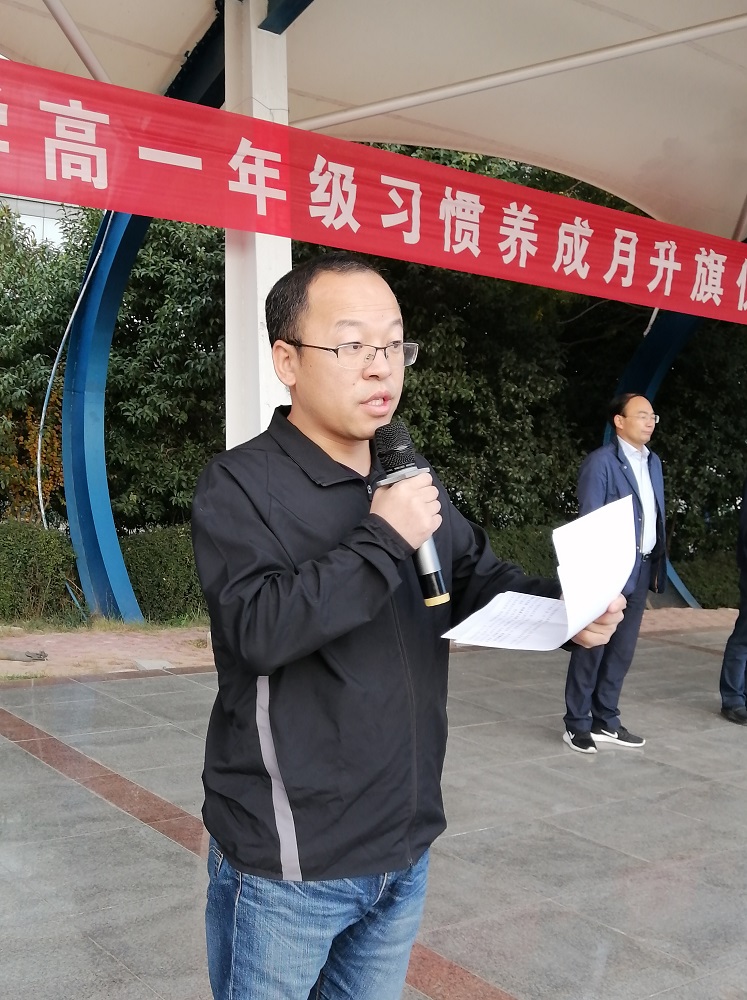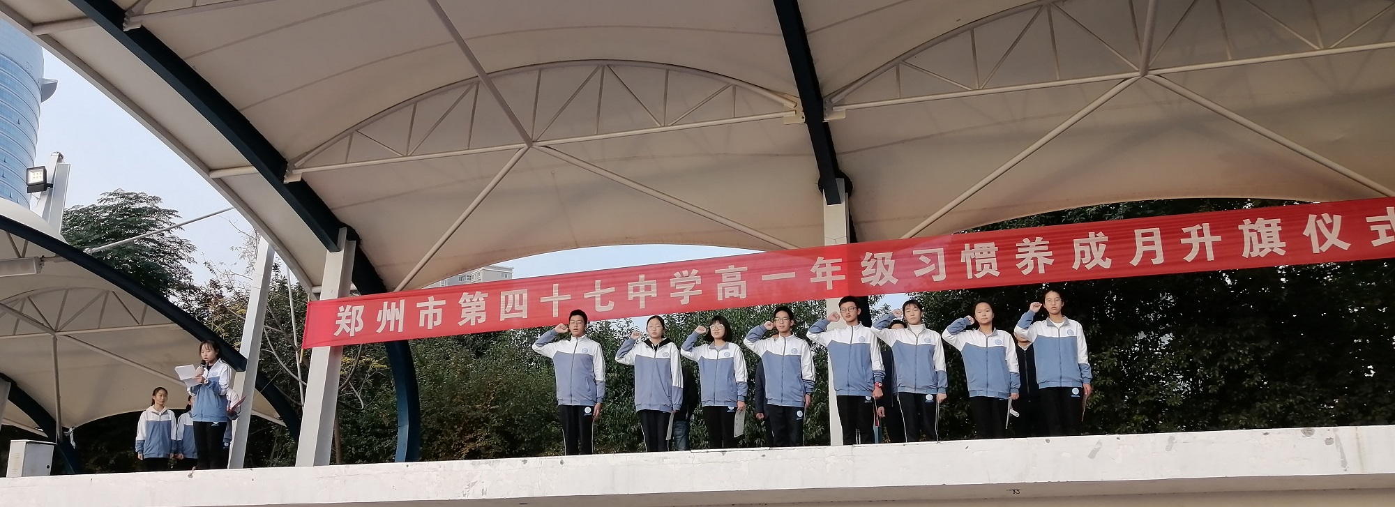 霜降已过,早晨的空气中已带着丝丝寒意。2019年10月28日,在晨曦中,高一年级全体学生在操场集合参加习惯养成月升旗仪式,做到了快、静、齐。郑州市第四十七中学副校长栗红涛、郑州市第四十七中学高一年级主管主任王伟,郑州市第四十七中学高一年级副主任桂正文、于文飞参加了这次升旗仪式。