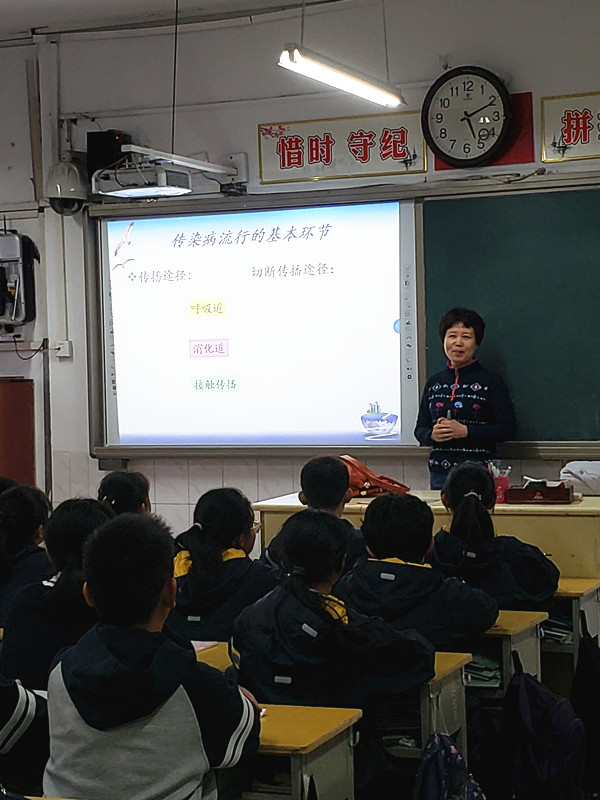 讲座上,孙霞利用图片、宣传手册生动形象地给孩子们介绍了什么是传染病。以及传染病流行的原因。接着,她利用多媒体课件,创设情境与孩子们进行互动交流,采取游戏、竞答等多种方式就常见传染病(如流行性感冒、流行性腮腺炎、流脑、手足口病、水痘等)的症状及传播特点、预防和控制等方面作了详细的讲解。随后,她告诉孩子们秋季日常气温变化大,一些肠道传染病和虫媒传染病极易爆发,甚至可能流行,因此秋季加强传染病的防治,对保护好自己的身体健康具有重要意义。她还让同学们熟记了预防疾病的15字要诀:洗净手、喝开水、吃熟食、常通风、晒衣被。