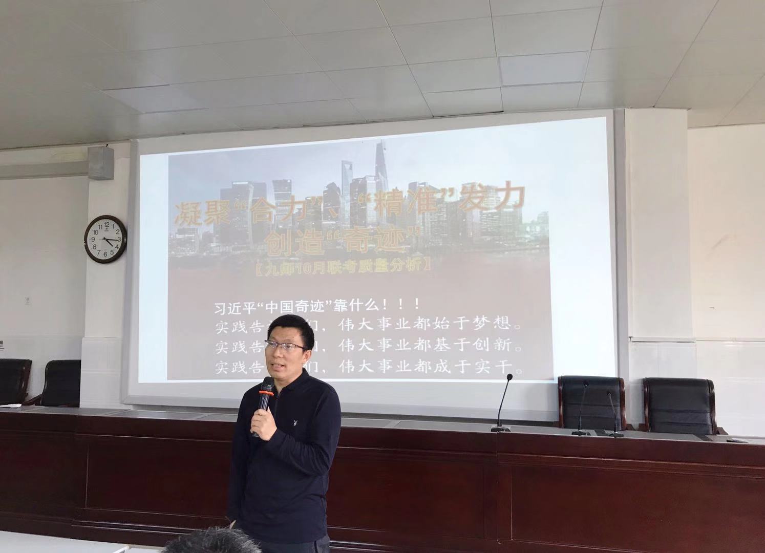 在会上,年级长孙志刚老师对上阶段联考成绩进行了详细的分析,对上阶段的教学工作进行了总结,并提出下阶段的工作计划。孙志刚表示,在复习备考中,所有老师都要牢固树立“面向所有学生,给每一个学生成功的自信和希望”这一理念,紧紧围绕两个团队——班主任团队和备课组团队,做好四项工作:围绕学情抓备考,围绕课堂抓质量,围绕教学抓管理,围绕高考抓培养,向教学过程要质量,向高效课堂要效益。