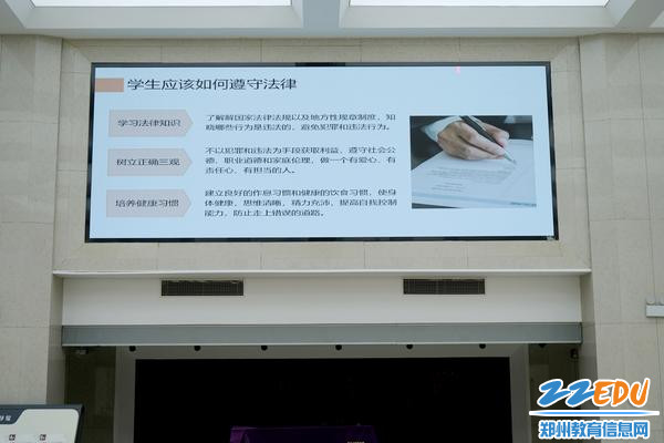 随后,学校充分利用校园公共宣传阵地,将法治教育融入师生日常生活场景。校园内的大型电子显示屏持续滚动播放法律知识内容,涵盖《中华人民共和国教育法》《中华人民共和国未成年人保护法》以及与学生权益保障、交通安全、消防安全等密切相关的法律常识,通过简洁明了的文字、生动形象的案例解读,让师生在进出教学楼、食堂就餐等日常活动中,能够随时接触法律知识,潜移默化地提升法治认知,让法律宣传“看得见、入人心”。