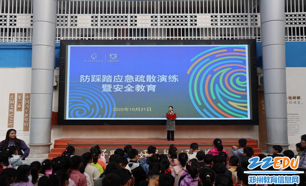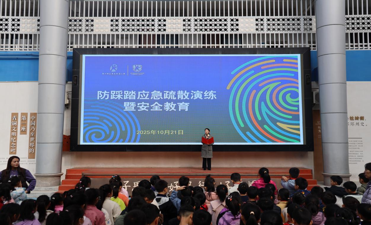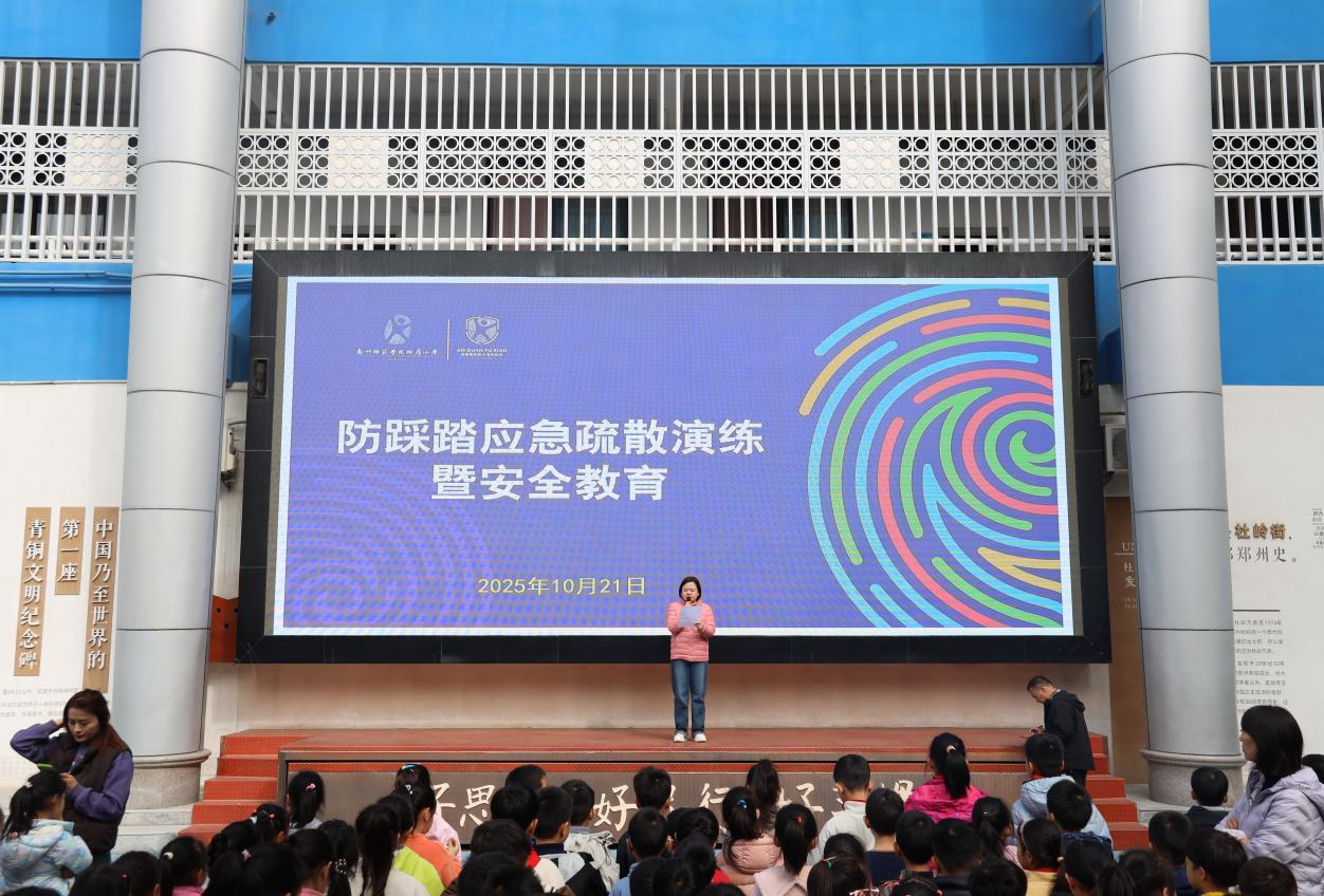 安全是校园工作的生命线,责任是守护师生的压舱石。为切实强化全体师生的安全防范意识,提升应对突发踩踏事件的应急避险与自救互救能力,从源头上防范校园安全事故发生,2025年10月21日上午,郑州师范学院附属小学精心组织开展防踩踏应急疏散演练活动。演练由学校后勤保障中心主任郭雯雯主持。